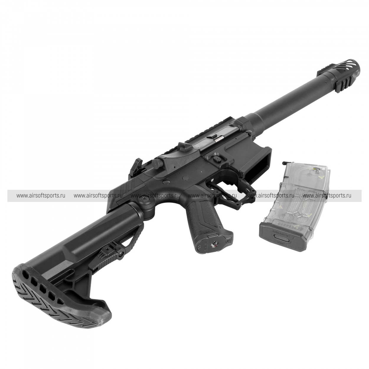 SSG-1 выглядит очень необычно, футуристично и по-спортивному агрессивно. У него вытянутый и при этом максимально облегчённый силуэт, в котором почти нет лишних элементов. Длинная передняя часть с цилиндрическим кожухом и выразительным дульным устройством делает профиль стремительным, а компактный верхний ресивер с короткой планкой подчеркивает современную минималистичную стилистику. Отдельного внимания заслуживает зона рукояти и спусковой скобы — здесь конструкция выглядит особенно нестандартно и придает модели характер спортивного кастомного привода. Регулировка угла наклона приклада необходима для игроков Speed Soft, для более удобного использования маски. Полупрозрачный магазин добавляет интересный акцент и хорошо сочетается с общей концепцией.