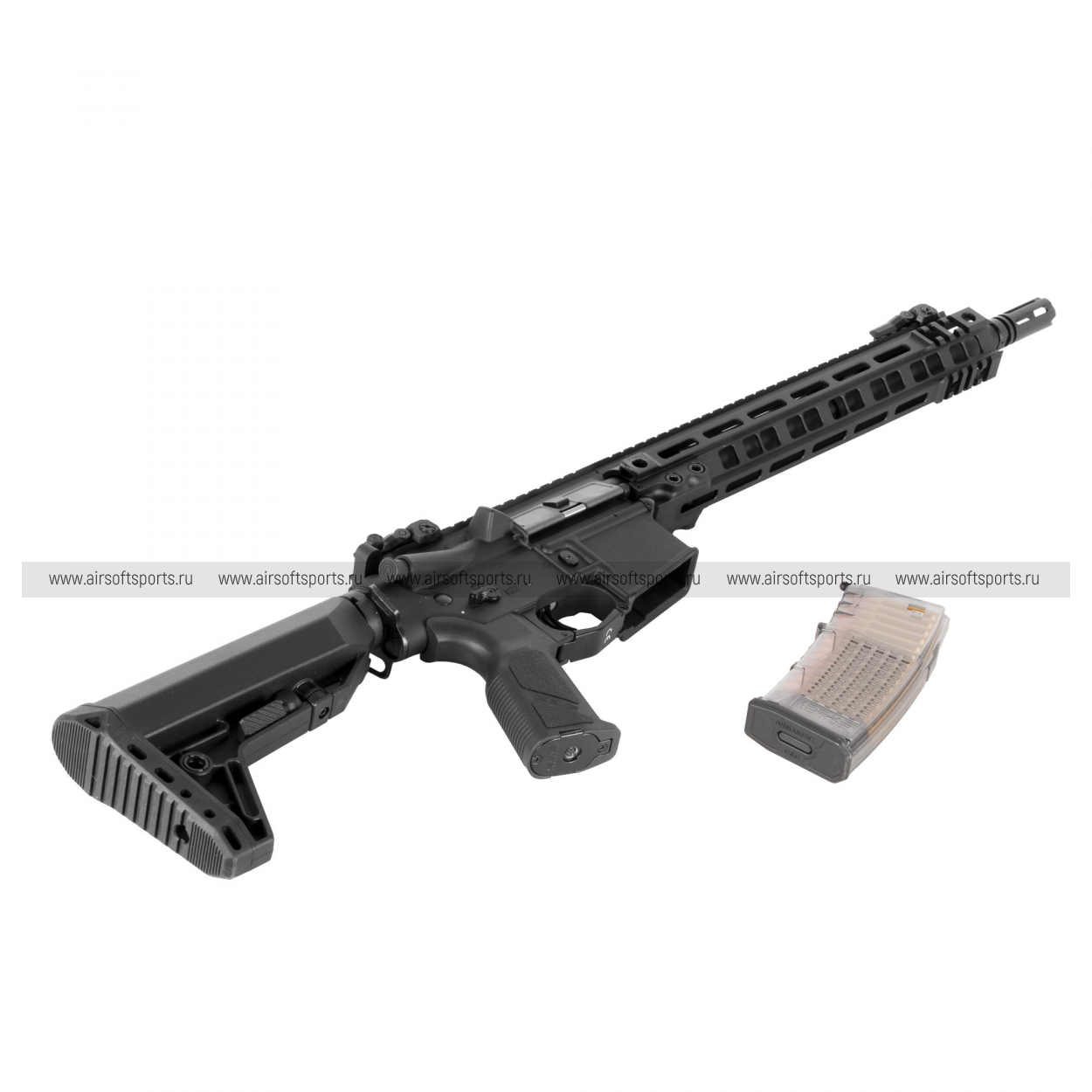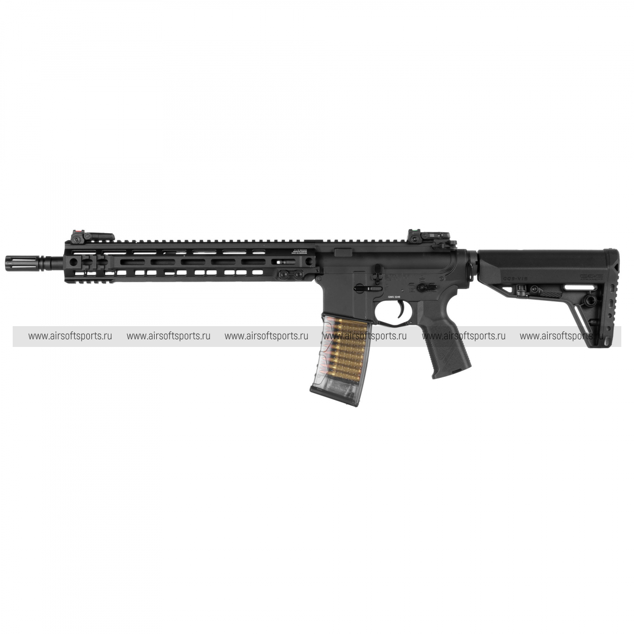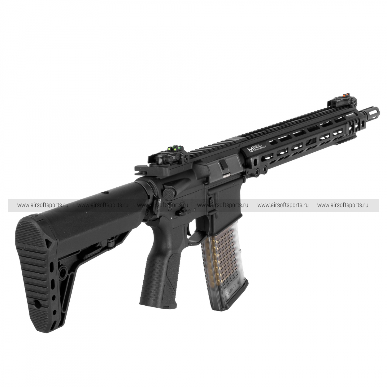 TR16 GMS MK2 13.5" выглядит строго, современно и очень функционально. Длинное облегчённое цевьё с большим количеством продолговатых слотов делает силуэт вытянутым и динамичным, а верхняя планка по всей длине корпуса и цевья визуально объединяет конструкцию в цельный профиль. Складные механические прицельные приспособления органично дополняют образ, а компактный дульный тормоз на конце ствола добавляет передней части аккуратный тактический акцент. Телескопический приклад с лаконичной формой делает заднюю часть визуально собранной, а эргономичная пистолетная рукоять и полупрозрачный магазин с имитацией патронов добавляют модели современный и более выразительный вид. В целом привод смотрится универсально, технологично и отлично вписывается в стиль актуальных AR-платформ.