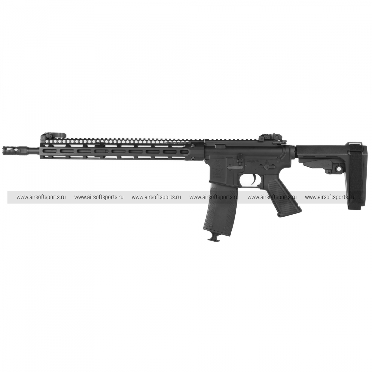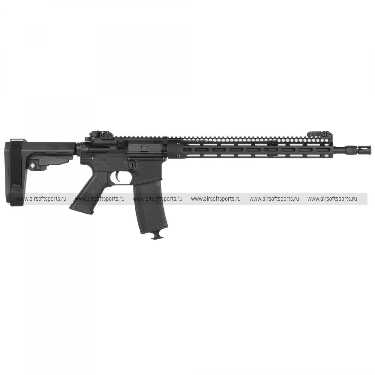 EMG Troy Industries SOCC M4 обладает современным и тактическим дизайном, который сочетает в себе стиль и функциональность. Винтовка оснащена лёгким, но прочным алюминиевым цевьём M-Lok, обеспечивающим удобство установки дополнительных аксессуаров, таких как фонари, рукоятки или лазерные указатели. Верхняя планка Picatinny проходит по всей длине, что позволяет легко монтировать оптические прицелы или коллиматоры. Приклад выполнен в стиле EMG "Brace", что придаёт оружию компактный и агрессивный вид, характерный для карабинов с коротким стволом (SBR). Общий внешний вид винтовки подчёркивает её тактическую направленность, делая её не только функциональной, но и визуально привлекательной.