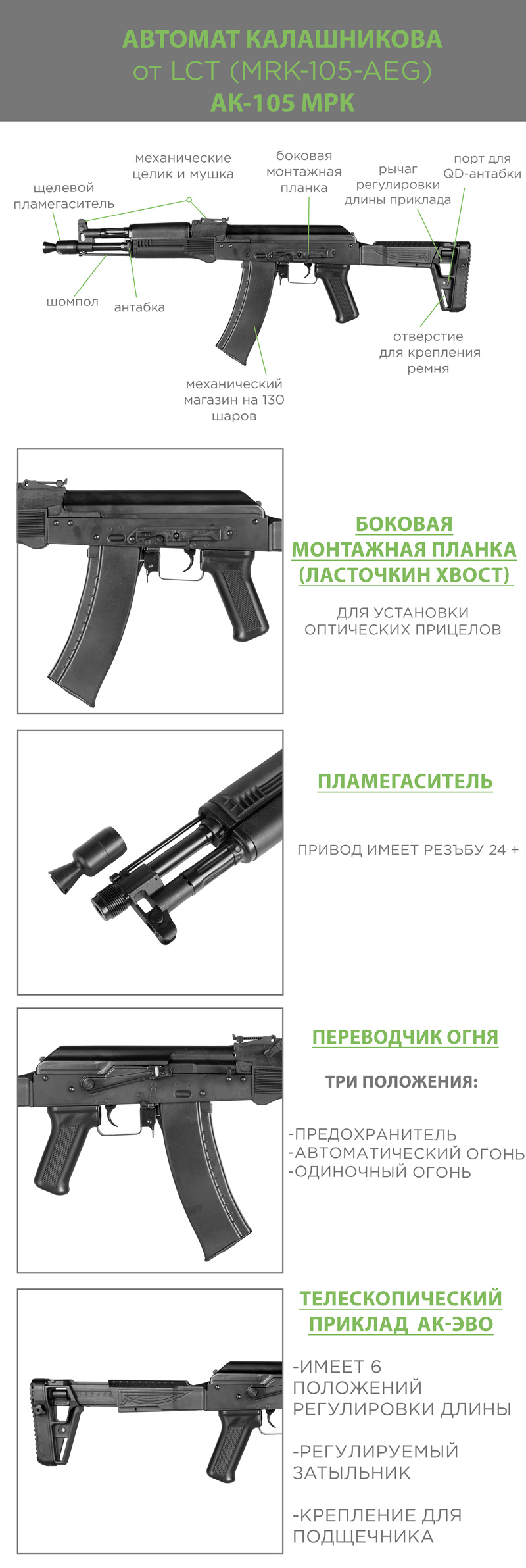Страйкбольный автомат MRK-105-AEG - копия компактного россйиского автомата - АК-105, изготовленная LCT. В страйкбольной версии установлена другая модель приклада. MRK-105-AEG входит в новую линейку страйкбольных автоматов LCT - MRK.