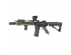 Отсек под аккумулятор расположен под крышкой ствольной коробки.Электрическая часть механизма способна без каких-либо модификаций работать с аккумуляторами с высокой токоотдачей, такими как литий-полимерные, напряжением 11.1В. Благодаря модернизированному узлу хоп-ап, внутри отсека достаточно свободного места для установки стандартных аккумуляторов AK типа. Разъем - T-Plug. Одного заряда аккумулятора хватает на несколько часов работы. Аккумулятор в комплект не входит!