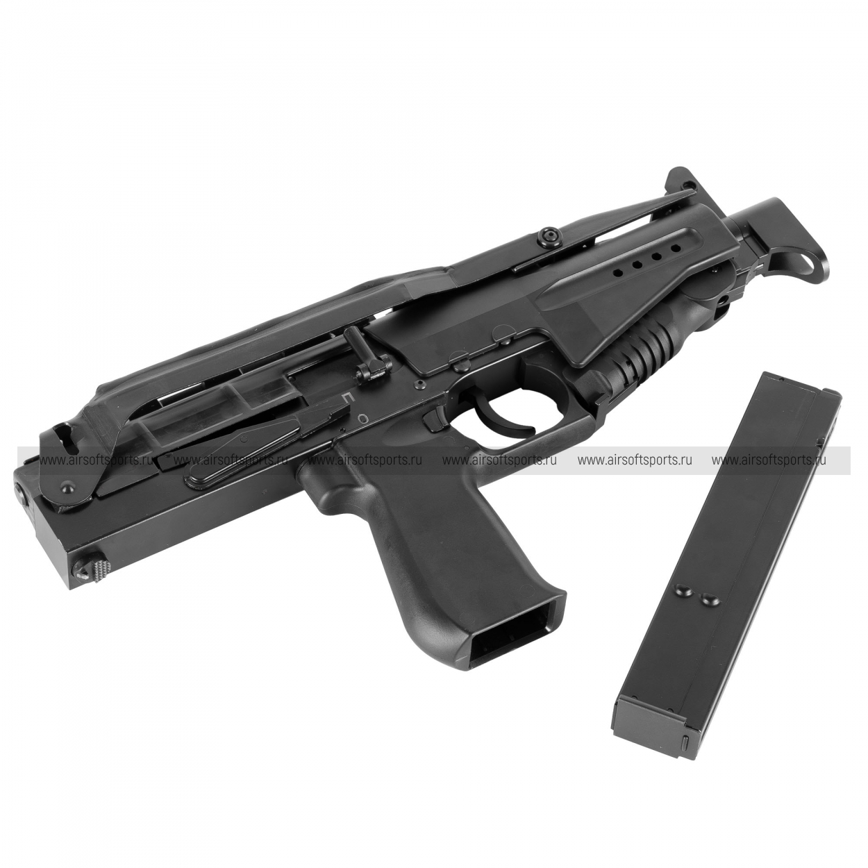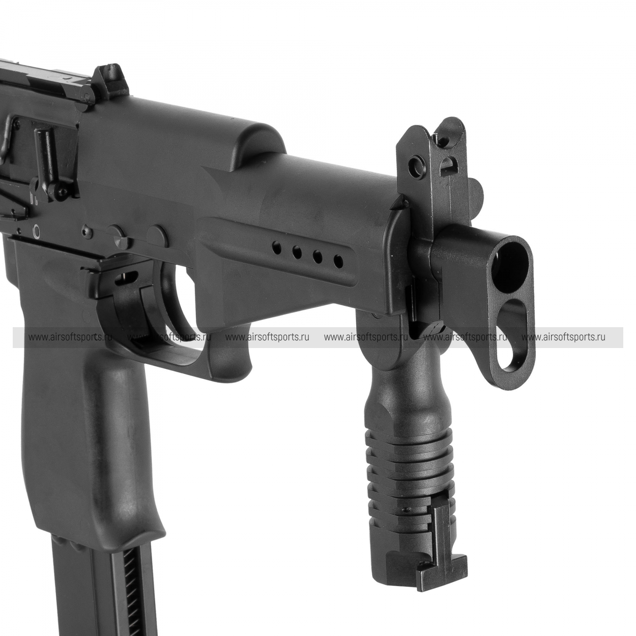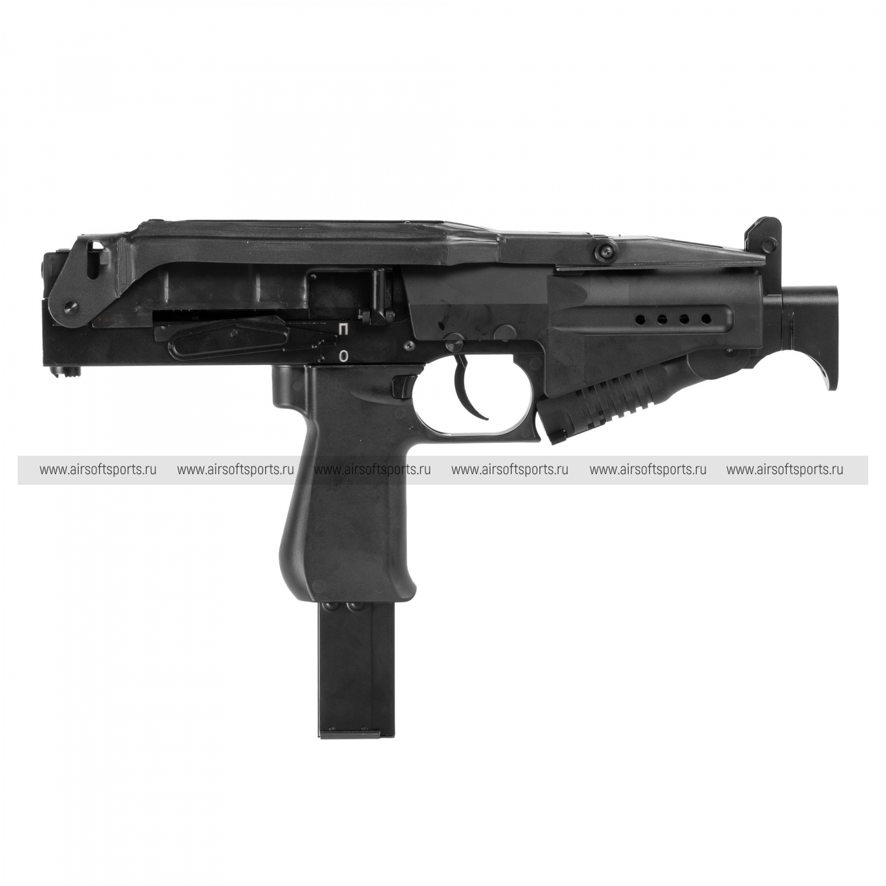RAPTOR СР-2М GBB выглядит узнаваемо и очень самобытно. Модель отличается плотной, компактной компоновкой, прямолинейным корпусом и характерным силуэтом с магазином, расположенным в пистолетной рукояти. Передняя часть дополнена вертикальной рукоятью, которая усиливает впечатление оружия, созданного для быстрого контроля при стрельбе навскидку. Отдельного внимания заслуживает складной металлический приклад: в разложенном виде он заметно вытягивает силуэт, а в сложенном сохраняет общую компактность конструкции. В целом модель производит впечатление утилитарного, специализированного и очень характерного образца.