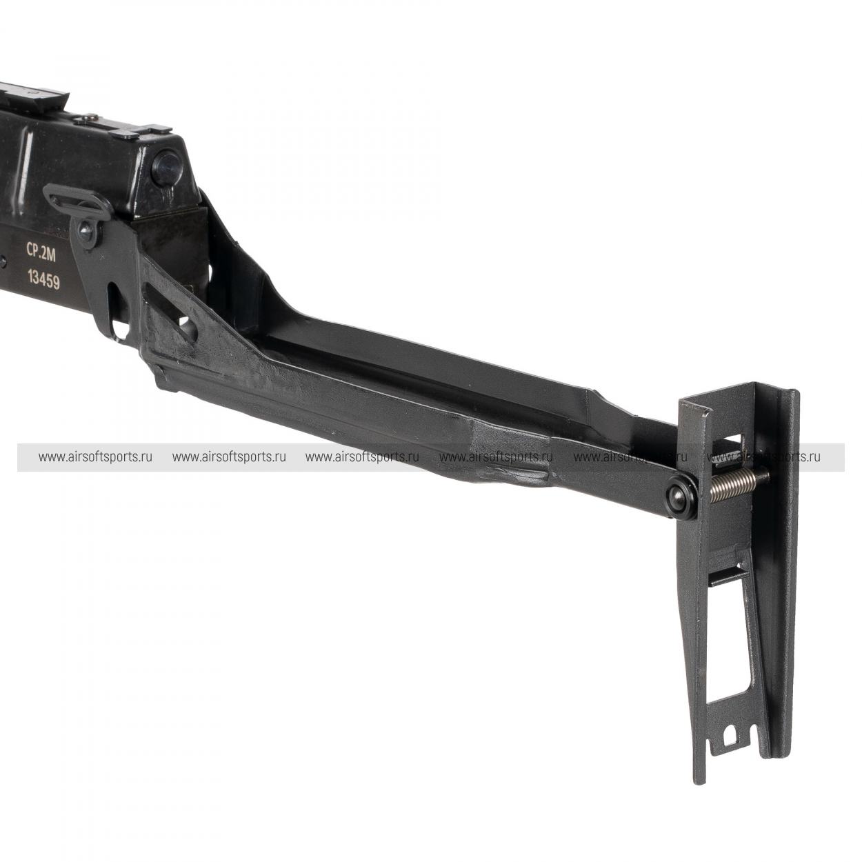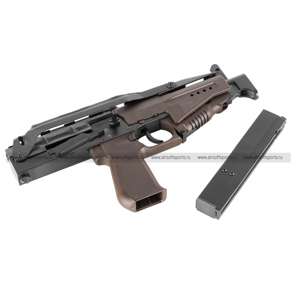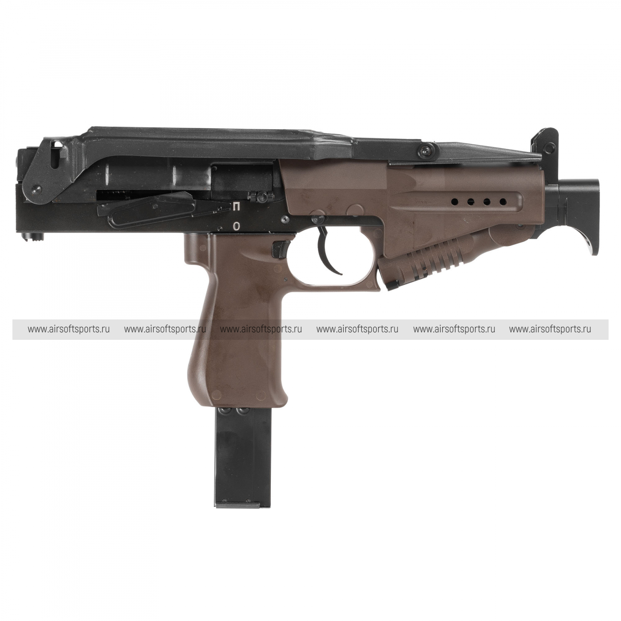 RAPTOR СР-2М GBB выглядит узнаваемо и очень самобытно. Модель отличается плотной, компактной компоновкой, прямолинейным корпусом и характерным силуэтом с магазином, расположенным в пистолетной рукояти. Передняя часть дополнена вертикальной рукоятью, которая усиливает впечатление оружия, созданного для быстрого контроля при стрельбе навскидку. Отдельного внимания заслуживает складной металлический приклад: в разложенном виде он заметно вытягивает силуэт, а в сложенном сохраняет общую компактность конструкции. В целом модель производит впечатление утилитарного, специализированного и очень характерного образца.