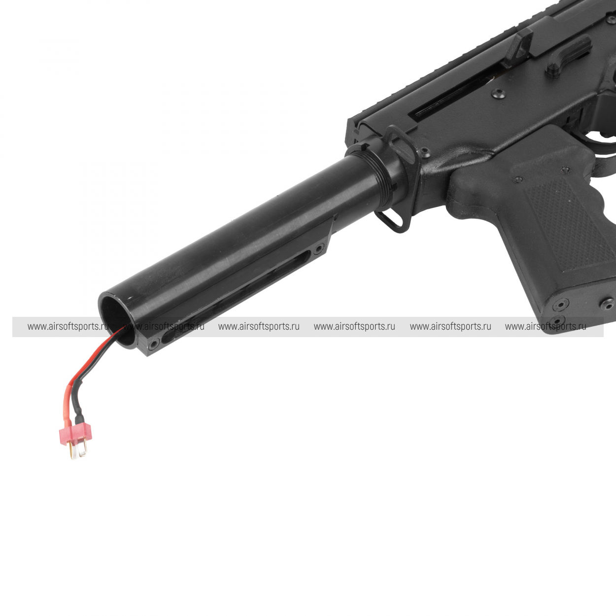 Автомат имеет телескопический приклад, который позволяет адаптировать привод под индивидуальные предпочтения пользователя. С обеих сторон приклада предусмотрен слот под QD-антабку и петля для стропы ремня.