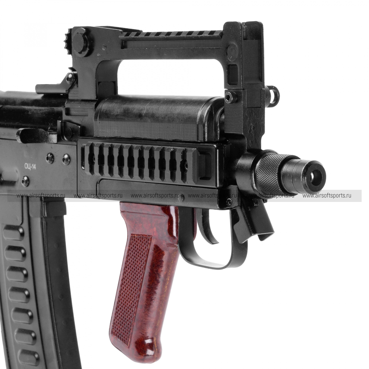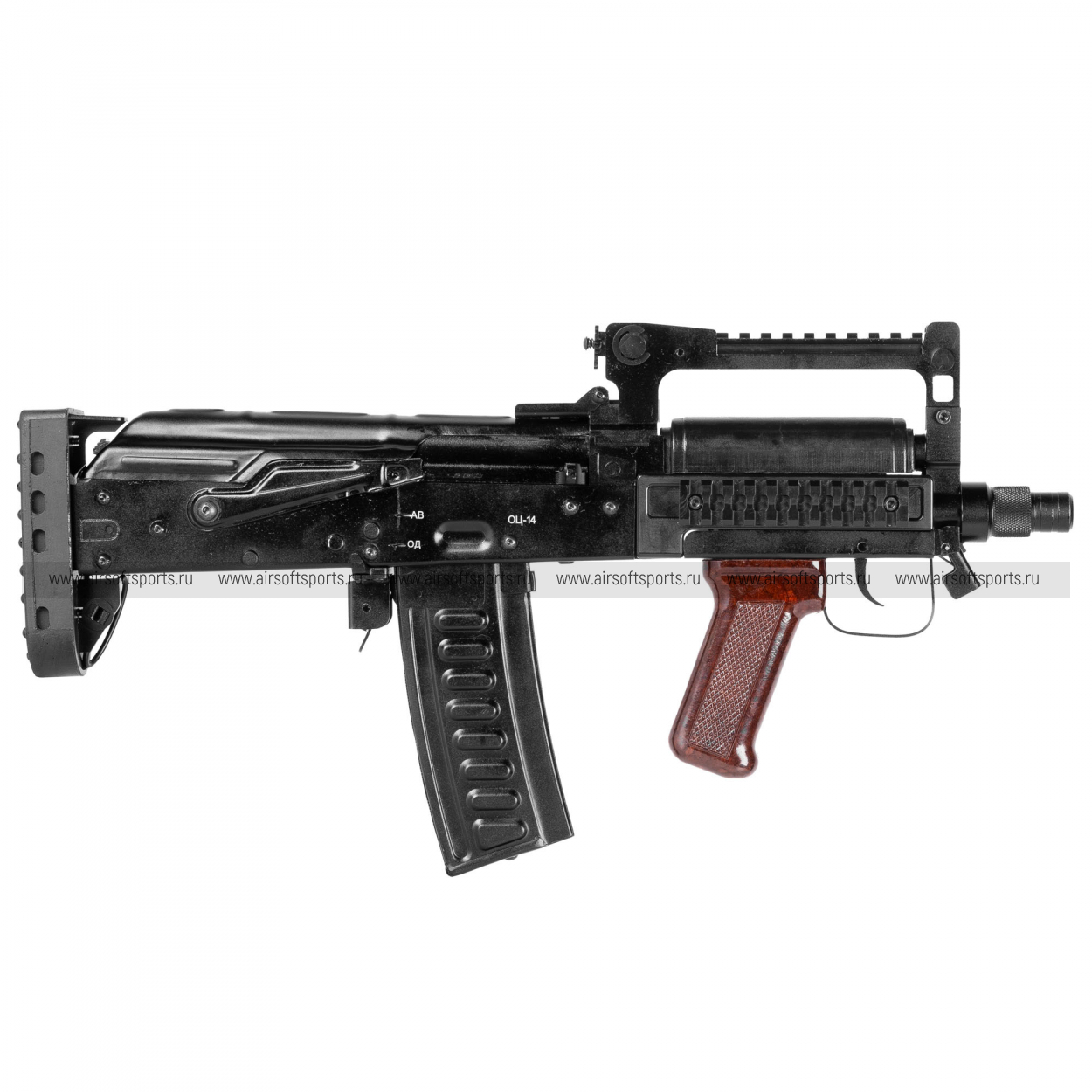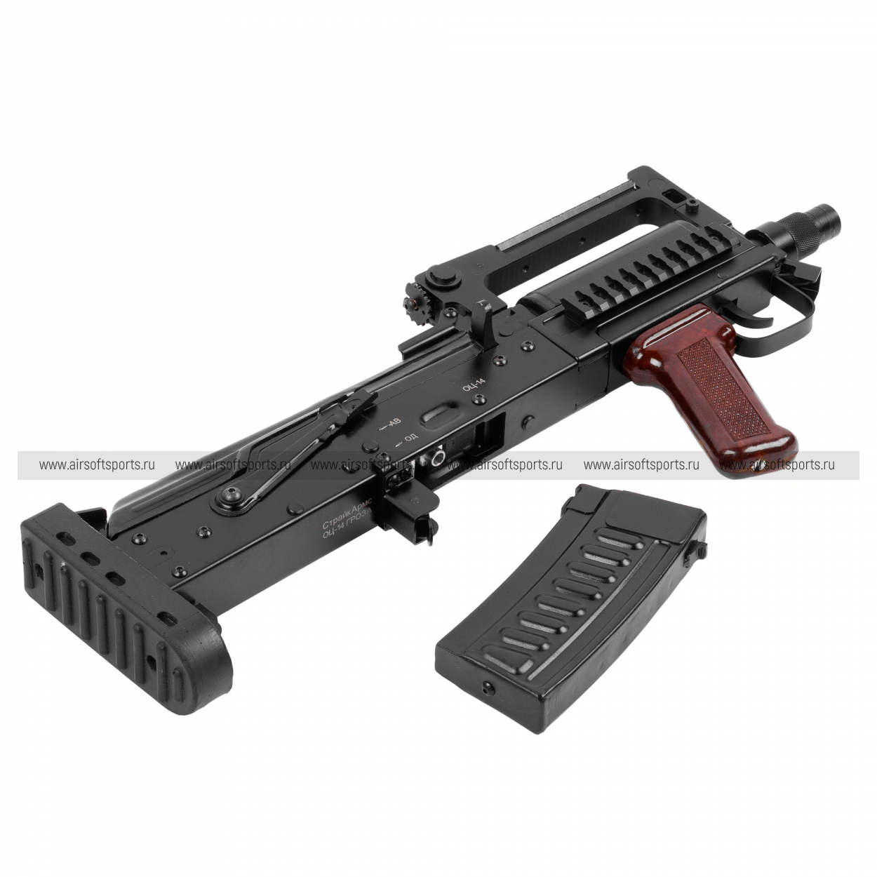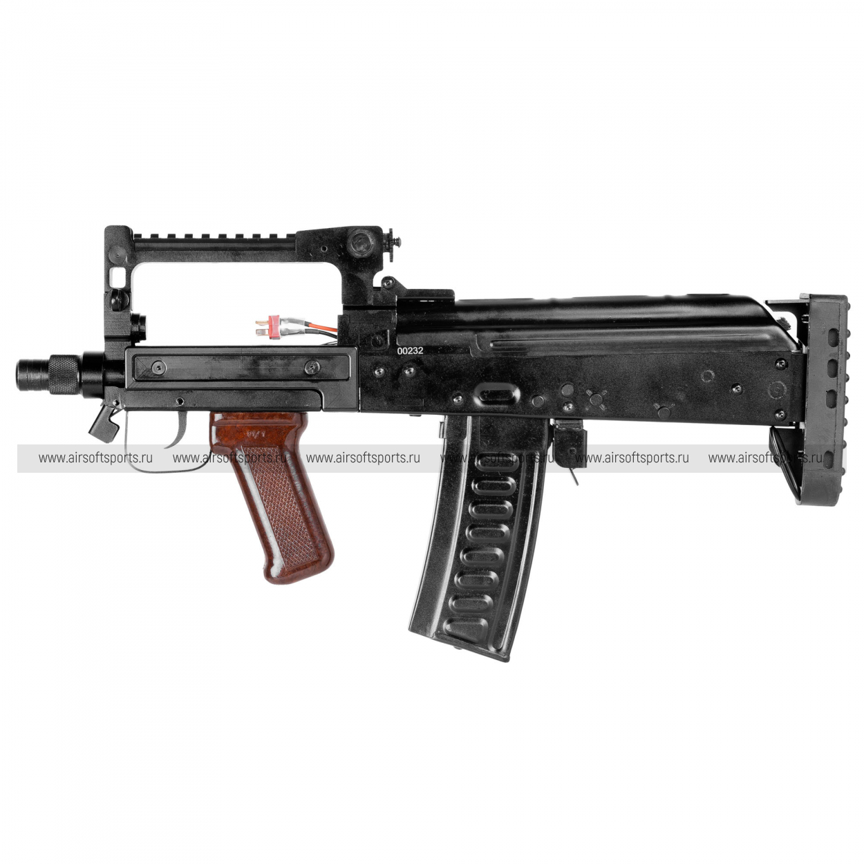 СтрайкАрмс «Гроза» AEG выглядит как редкий, очень характерный буллпап: чёрный «индустриальный» корпус, верхняя рукоять с планкой, короткий передок и контрастная коричневая рукоять создают узнаваемый, брутальный образ, который резко выделяется на фоне классических АК и М-серии.