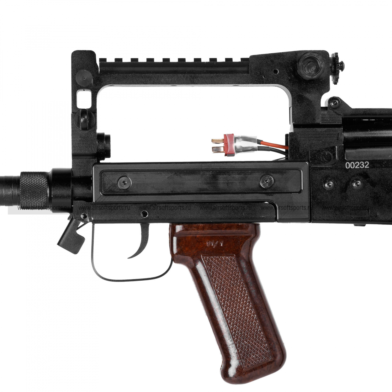 Отсек под аккумулятор расположен в цевье. Электрическая часть механизма способна без каких-либо модификаций работать с аккумуляторами с высокой токоотдачей, такими как литий-полимерные, напряжением 7,4В. Однако мы рекомендуем использовать аккумуляторы 11.1В. Тип аккумулятора CQB/АК. Разъем - T-Plug. Аккумулятор в комплект не входит!