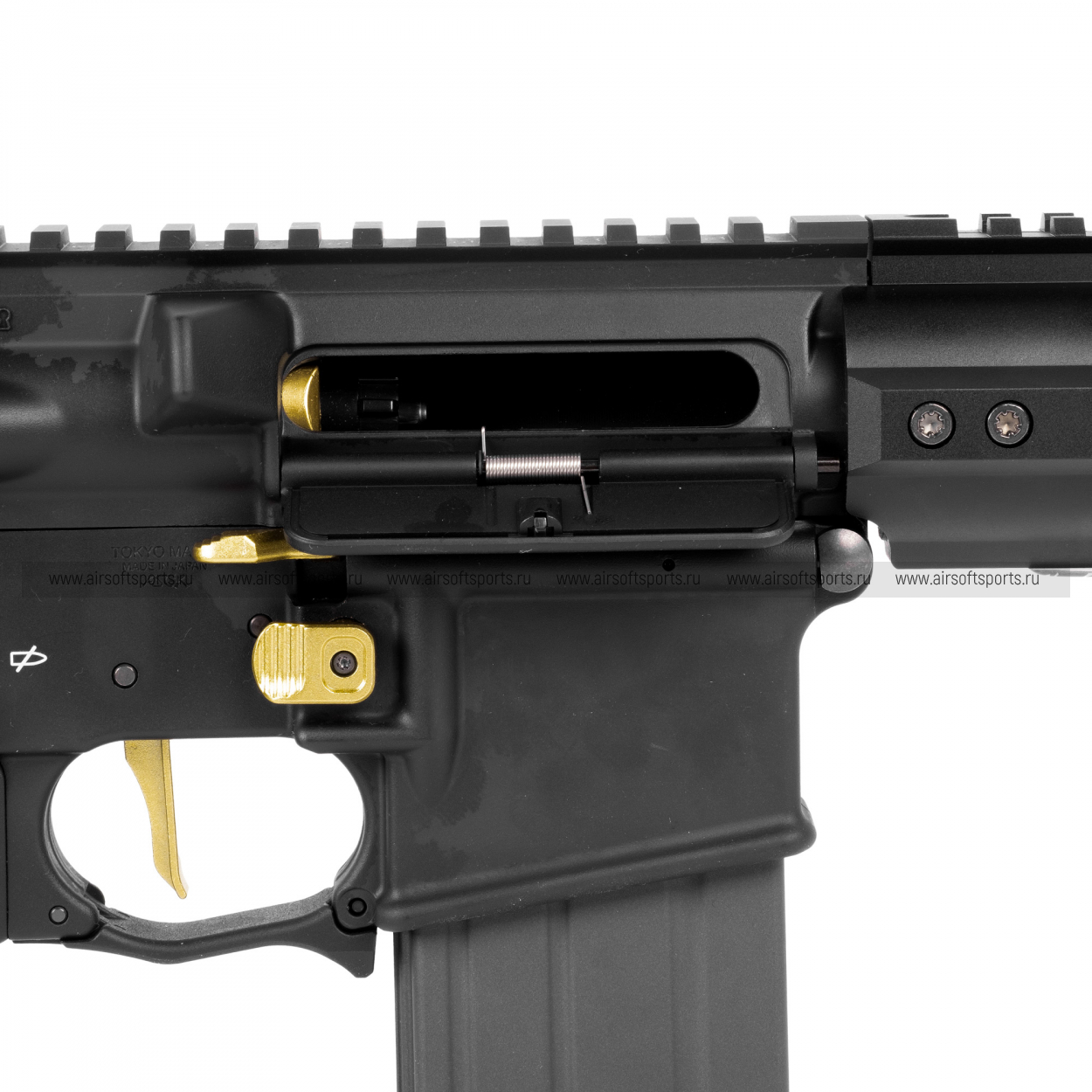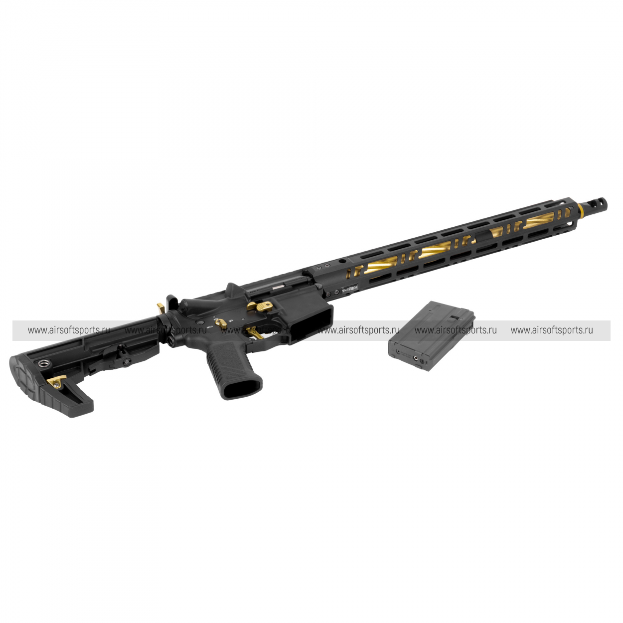 MTR16 G-Edition — это современная интерпретация M4 с “биллет”-стилистикой ресивера, удлинённой монолитной верхней планкой и тонким цевьём M-LOK, подчёркивающим спортивный характер модели. Двухцветное оформление с акцентами G-Edition смотрится эффектно и дорого: глубокий матовый тон Cerakote сочетается с благородными металлическими акцентами на органах управления и дульном устройстве, задавая узнаваемый премиальный образ без лишней вычурности. Агрессивный многокамерный компенсатор логично завершает линию длинного внешнего ствола, фаски и грани ресивера выполнены чётко, переходы ровные, маркировка и анодирование аккуратные. Телескопический приклад на стандартной трубе, текстурированная пистолетная рукоять и чистая верхняя линия “рейка в ноль” над ресивером и цевьём формируют стройный силуэт, где функциональность подано через минимализм и точные детали. В руках карабин выглядит монолитно и собранно: тонкий профиль передка, расширенная шахта магазина и аккуратные элементы управления завершают образ технологичного, быстого и эстетичного GBBR для тех, кто ценит и тактильную “живость” выстрела, и безупречный внешний вид.