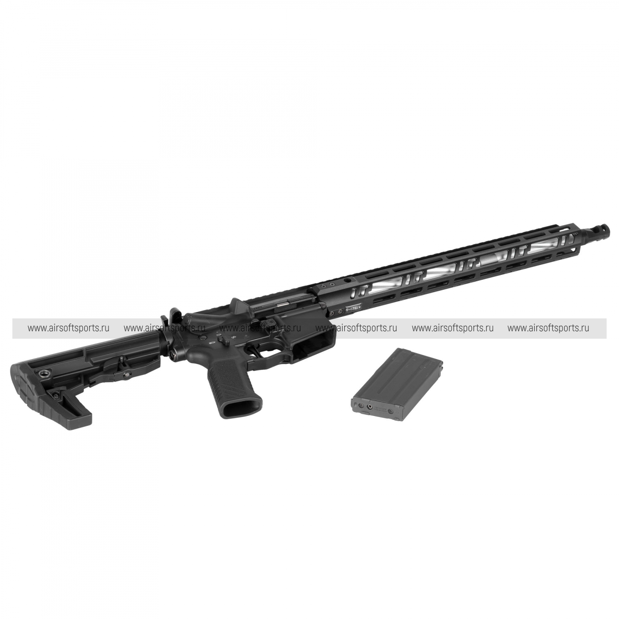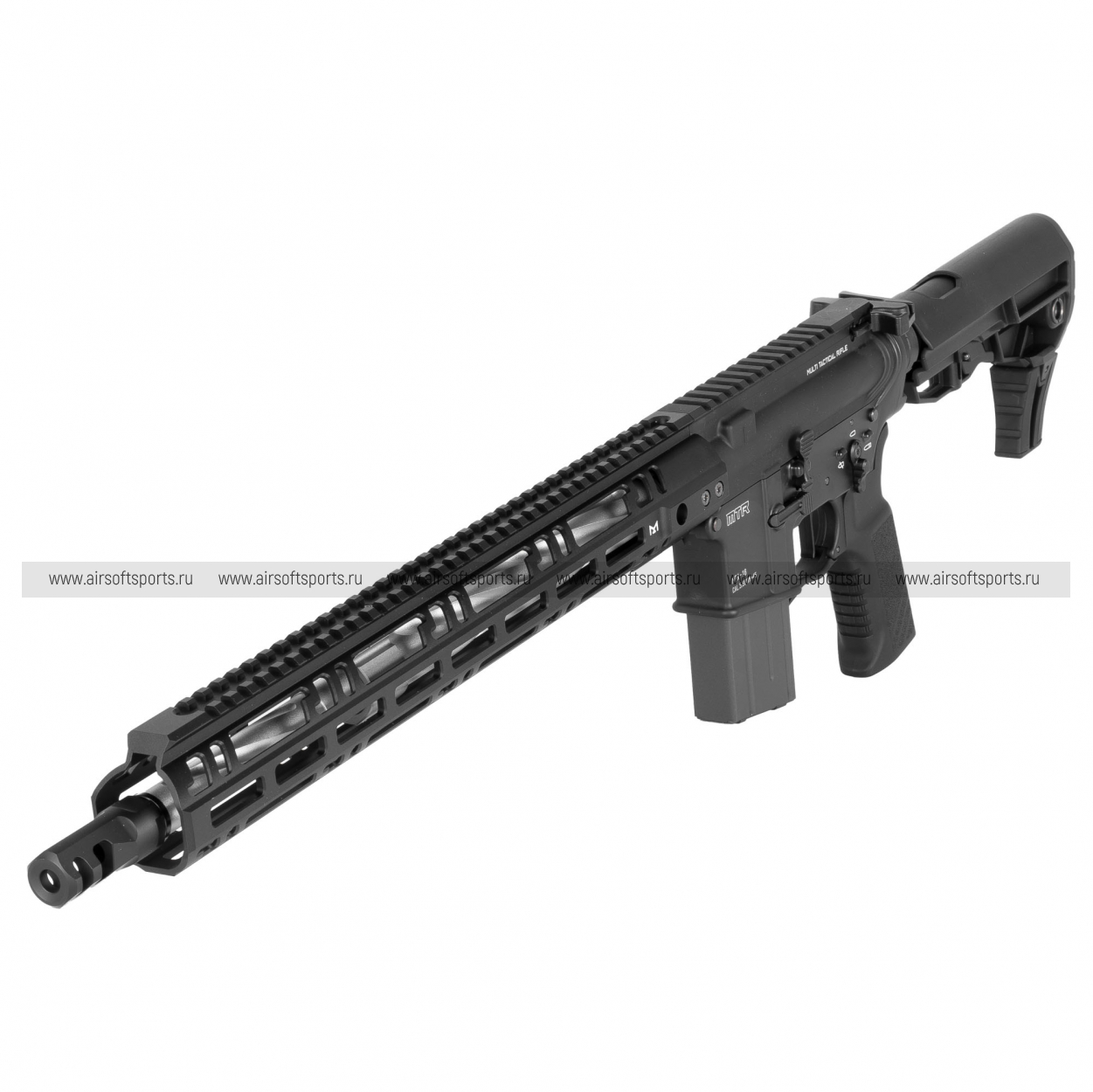 Tokyo Marui MTR16 выглядит очень современно, легко и агрессивно. Главный акцент в облике делает длинное облегчённое цевьё с крупными прорезями, которое придаёт модели стремительный, почти спортивный силуэт. Верхняя планка по всей длине корпуса визуально объединяет конструкцию в единую линию, а телескопический приклад и эргономичная пистолетная рукоять подчеркивают её практичный, прикладной характер. В итоге автомат производит впечатление высокотехнологичной, аккуратно собранной и по-настоящему актуальной платформы, ориентированной на современный стиль игры.