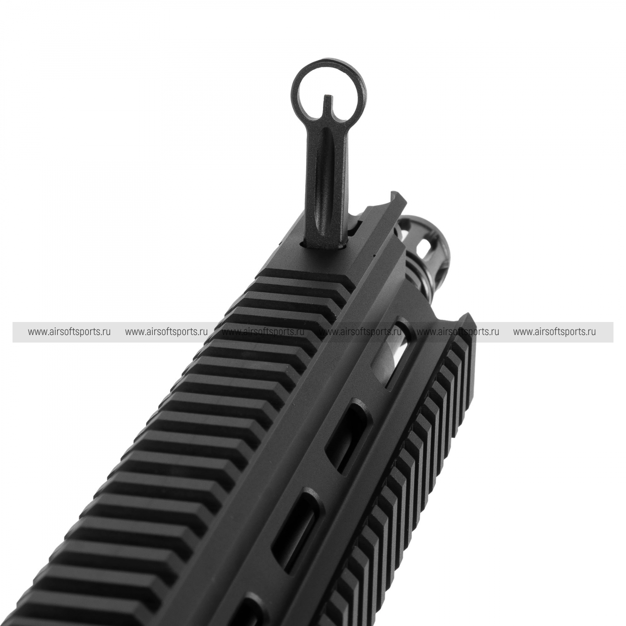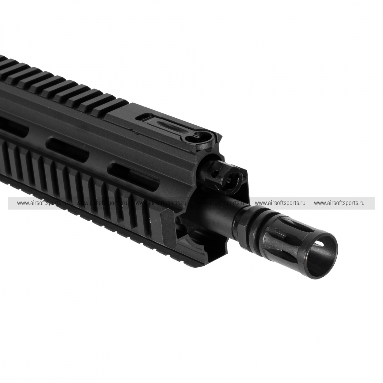 VFC HK416A5 выглядит строго, современно и очень собрано. У модели характерный силуэт с массивным верхом, развитым цевьём и длинной планкой для установки прицельных приспособлений, что сразу подчёркивает её тактическую направленность. Короткое цевьё с рельсовыми интерфейсами делает облик более функциональным и «рабочим», а телескопический приклад и эргономичная рукоять дополняют образ универсального штурмового автомата. В целом модель производит впечатление профессиональной, лаконичной и очень узнаваемой платформы, в которой всё подчинено практичности и контролю.