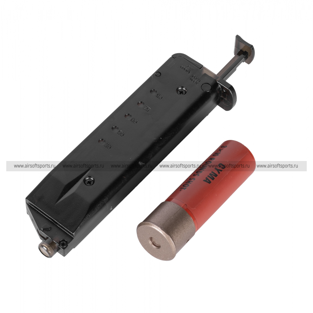 Механика неприхотлива и ресурсна: ход цевья ровный, усилие взведения комфортное и легко контролируется даже в перчатках, подача стабильна при полном цикле помпы. Внутри установлен фиксированный hop‑up на каждом канале, настроенный под шары средней массы, благодаря чему траектория остается ровной и повторяемой без дополнительных регулировок. Питание осуществляется от стандартных «шеллов»‑патронов, совместимых с TM‑форматом, обычно вмещающих до 30 шаров, что дает около десяти трехвыстрельных циклов на один патрон; перезарядка интуитивная и легко тренируется. Конструкция ориентирована на надежность в динамике CQB: отдача практически отсутствует, повторное прицеливание выполняется быстро, а пластиковый корпус снижает общую массу и уменьшает утомляемость на долгих играх.