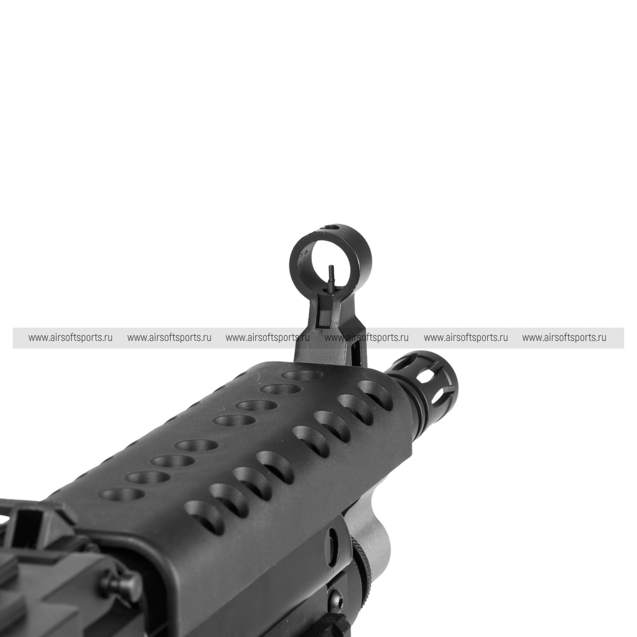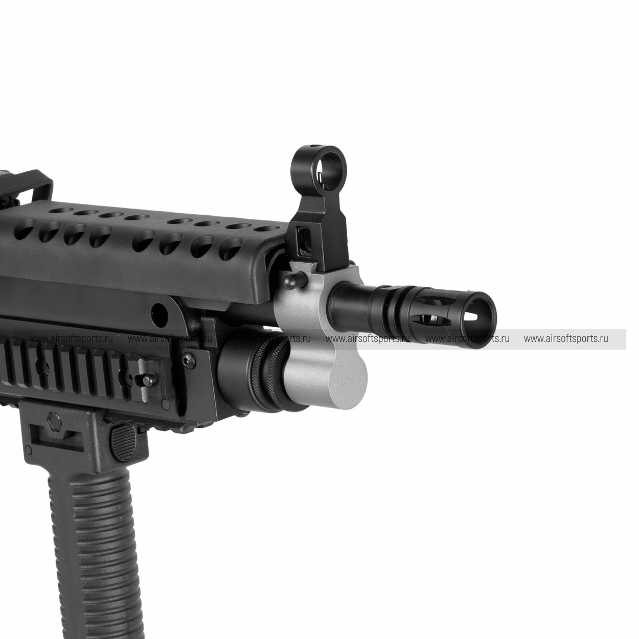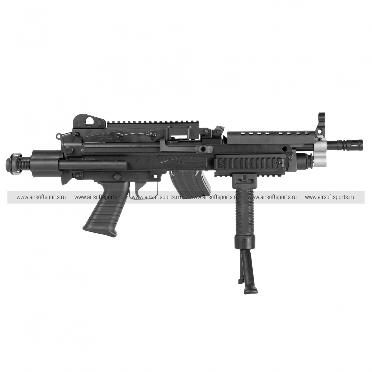 Внешне M249 K выглядит максимально «тактически»: короткий ствол и укороченная передняя часть делают силуэт собранным и агрессивным. Корпус выполнен в матовом чёрном цвете, с выраженной верхней планкой и характерной для платформы массивной ствольной коробкой. Спереди — цевьё с рельсовыми секциями и установленной вертикальной рукояткой, что подчёркивает штурмовой характер версии K. На оружии заметны складные сошки, а также элементы типичной «пулемётной» компоновки — широкий приёмник/крышка сверху и общий индустриальный, функциональный дизайн без лишних декоративных деталей.