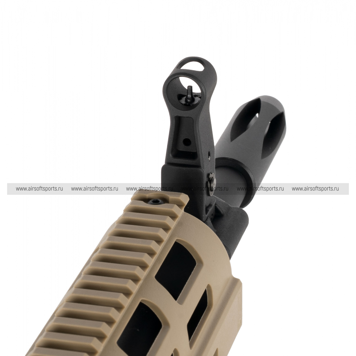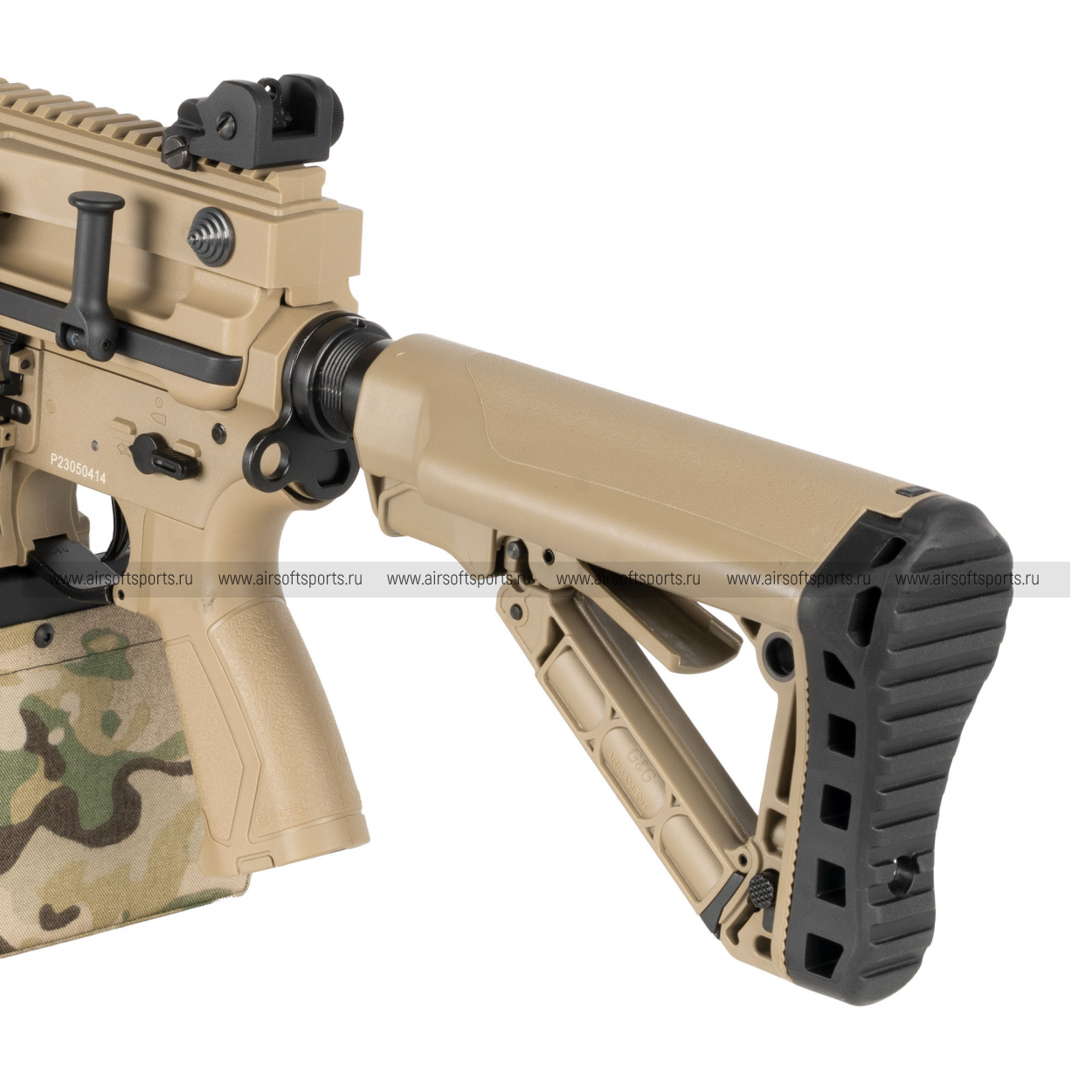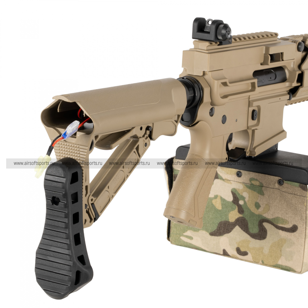CM16 LMG выглядит современно, агрессивно и очень функционально. Несмотря на принадлежность к классу пулемётов, модель сохраняет сравнительно компактный и аккуратный силуэт, благодаря чему воспринимается легче и динамичнее, чем классические массивные LMG-платформы. Короткое облегчённое цевьё с крупными продолговатыми прорезями делает переднюю часть визуально лёгкой, а установленная сошка сразу подчеркивает роль оружия поддержки. Короб для ленты и видимая имитация патронной ленты создают очень характерный пулемётный образ и делают модель особенно выразительной. Телескопический приклад, AR-образная эргономика и общая современная геометрия корпуса придают приводу универсальный и актуальный внешний вид. В песочном цвете модель смотрится особенно эффектно, сочетая тактическую практичность и ярко выраженный боевой стиль.