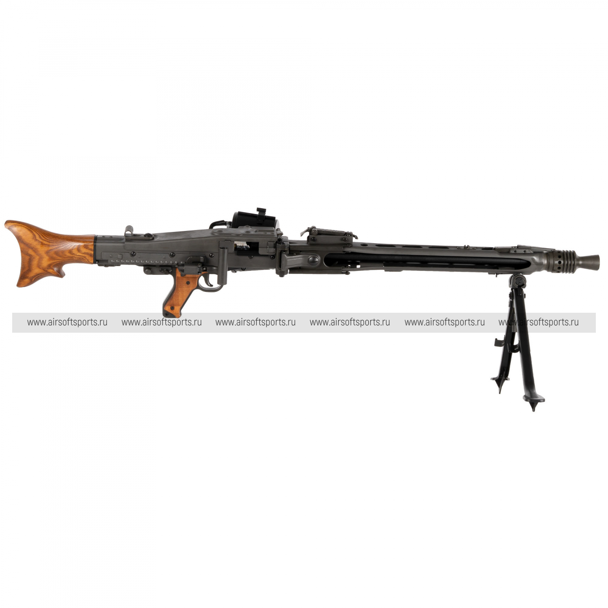 GMG42 выглядит очень внушительно, брутально и максимально аутентично. Длинный перфорированный кожух ствола, массивная ствольная коробка, характерное дульное устройство и крупная сошка формируют тот самый легендарный силуэт, который мгновенно узнаётся даже издалека. Деревянные элементы — приклад и рукоять — эффектно контрастируют с тёмным металлическим корпусом и придают модели выраженный исторический облик. Общая компоновка выглядит вытянутой, тяжёлой и очень серьёзной, подчёркивая статус полноценного оружия поддержки. Даже в статичном положении этот пулемёт производит сильное впечатление благодаря своей длине, узнаваемым пропорциям и классическому военному стилю. В целом модель выглядит крайне выразительно и отлично подойдёт тем, кто ценит историческую эстетику и максимально атмосферные реплики.