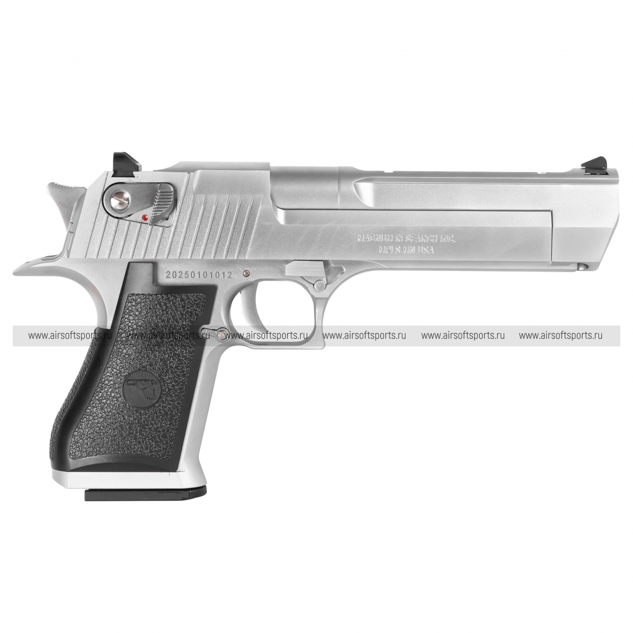 Cybergun Desert Eagle .50AE Silver выглядит внушительно, эффектно и очень статусно. Широкий затвор, массивная рамка и крупная рукоять формируют характерный тяжёлый силуэт, который сразу ассоциируется с Desert Eagle. Серебристое исполнение делает модель ещё более заметной, подчёркивая её формы и добавляя облику визуальной «премиальности». Контраст между светлым корпусом и тёмными накладками на рукояти смотрится особенно удачно, а общий образ пистолета получился ярким, агрессивным и по-настоящему культовым.