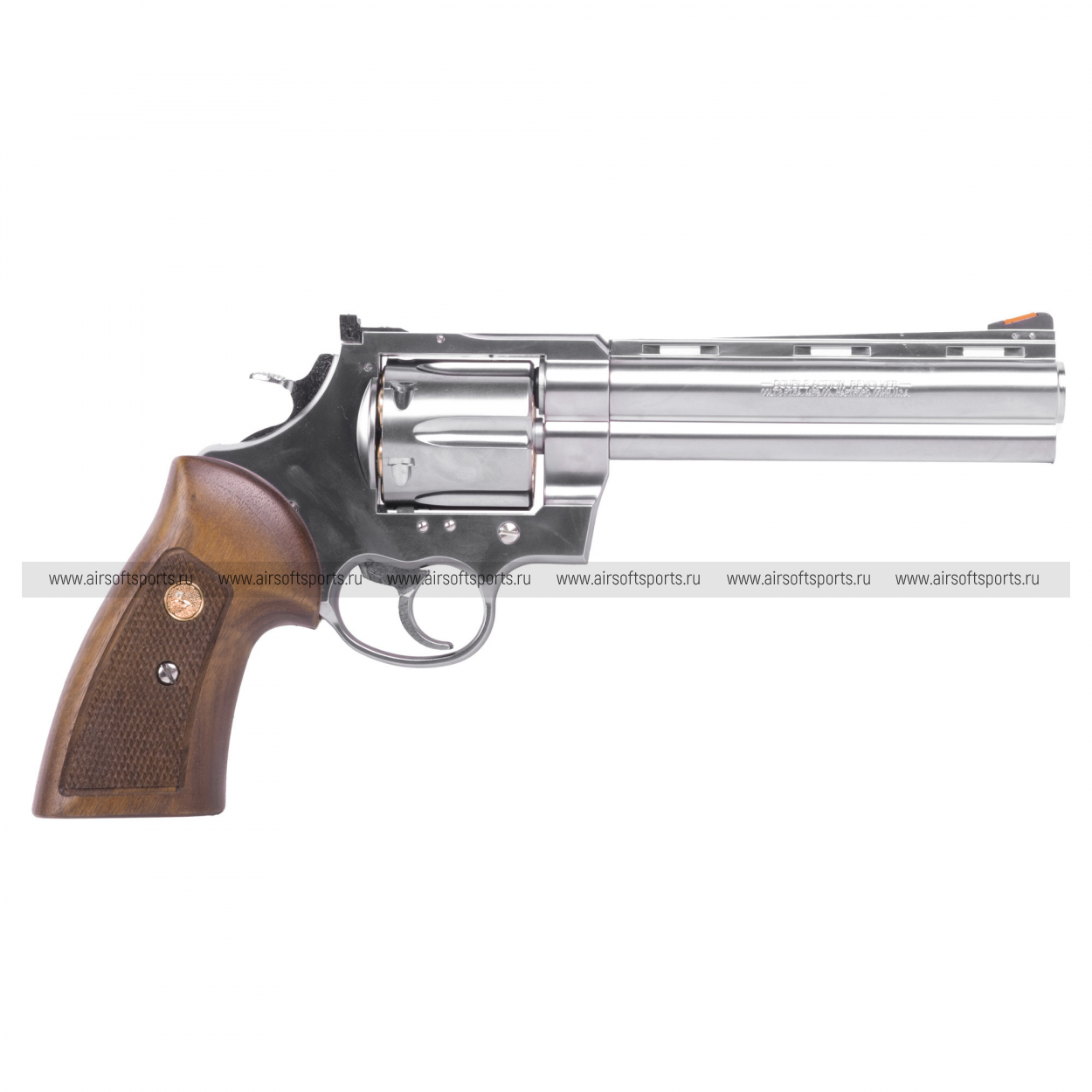 Marushin Anaconda .44 Magnum Revolver сразу привлекает внимание своим внушительным и элегантным внешним видом. Корпус револьвера выполнен из металла с ярким серебристым покрытием, которое придаёт модели эффектный блеск и подчёркивает её премиальный статус. Шестидюймовый ствол выглядит массивно и солидно, а его гладкая поверхность гармонично сочетается с остальными деталями.