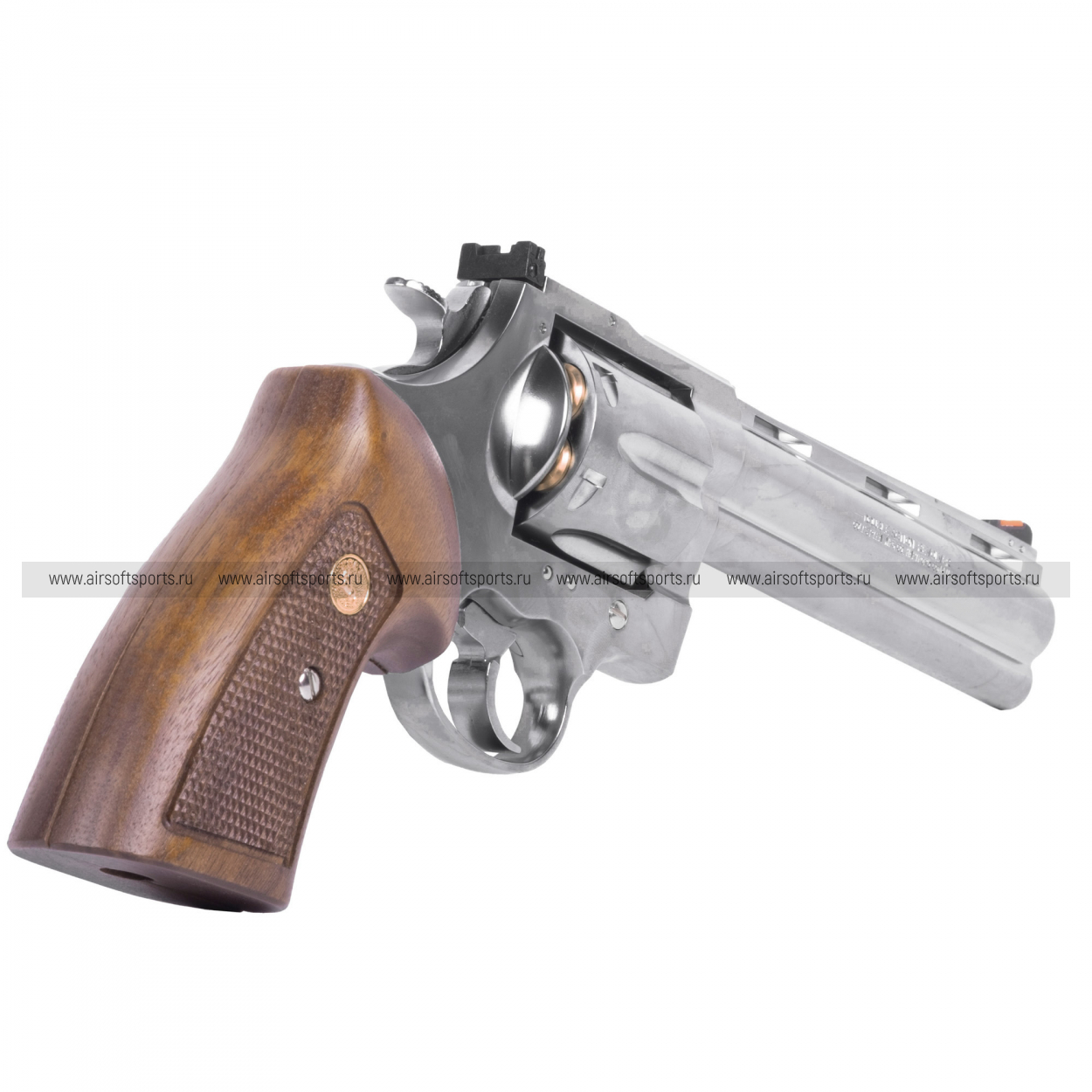 Корпус револьвера изготовлен из прочного металла с элегантным серебристым покрытием, что придаёт оружию солидный и эффектный внешний вид. Деревянная рукоять обеспечивает комфортный и надёжный хват, а также подчёркивает классический стиль револьвера.