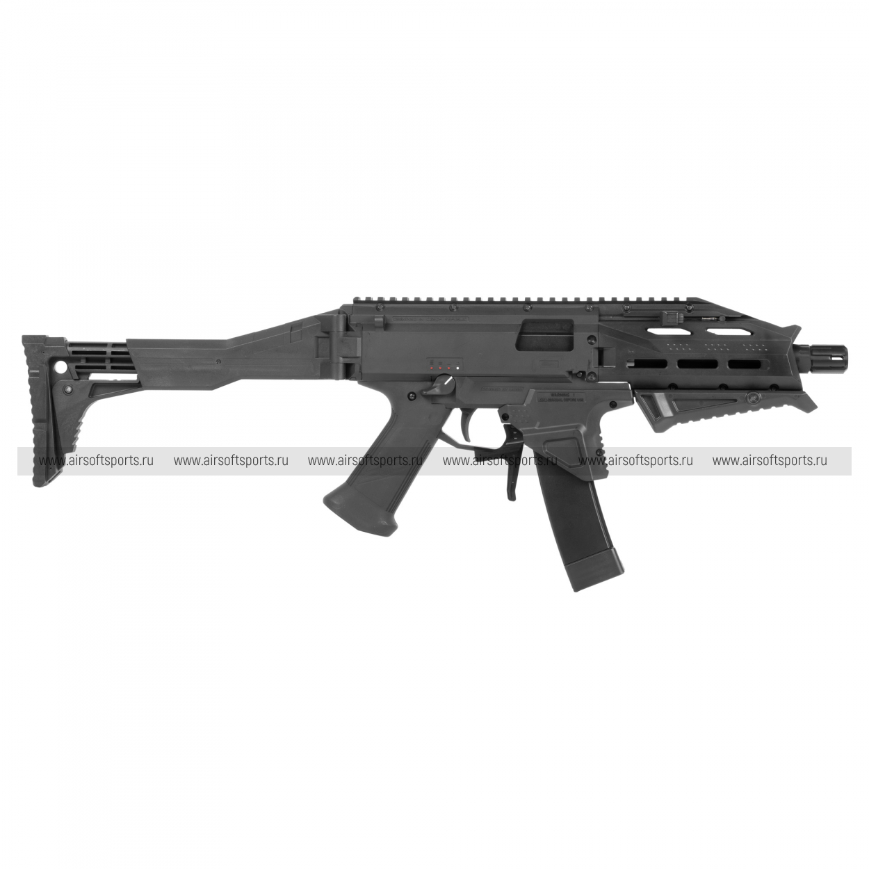 Версия ATEK сразу узнаваема за счёт агрессивного дизайна цевья и прицельной линии: матовый чёрный цвет подчёркивает строгую геометрию, а вытянутое цевьё с продольными окнами и фасками визуально «приземляет» силуэт и улучшает хват. На боках и снизу выполнены интерфейсы M‑LOK для лёгкого крепления аксессуаров, а комплектный угловой передний упор органично вписан в контур, добавляя контролируемости без лишнего объёма. Расширенная горловина магазина (фларованный магвелл) делает перезарядку быстрее и придаёт передней части характерный «мускулистый» вид. Верх закрывает сплошная планка Пикатинни — от прицельной базы до тыльной части — со складными механическими прицелами низкого профиля. Двусторонние органы управления крупные и наглядные: флажки предохранителя/переводчика огня дублируются, рычаг взведения может переставляться, кнопки сброса магазина выступают ровно настолько, чтобы их легко нащупать в перчатках. Фирменный пламегаситель ATEK завершает ствол и визуально балансирует передок; при этом общий силуэт остаётся компактным и «собранным». Складной телескопический приклад с резиновым затыльником добавляет монолитности плечевому упору, а продуманные точки крепления ремня позволяют носить EVO 3 как на одной, так и на двухточечной подвеске. В руках модель выглядит современно и технологично, сохраняя узнаваемые черты семейства Scorpion и подчёркнутую функциональность спортивного инструмента.