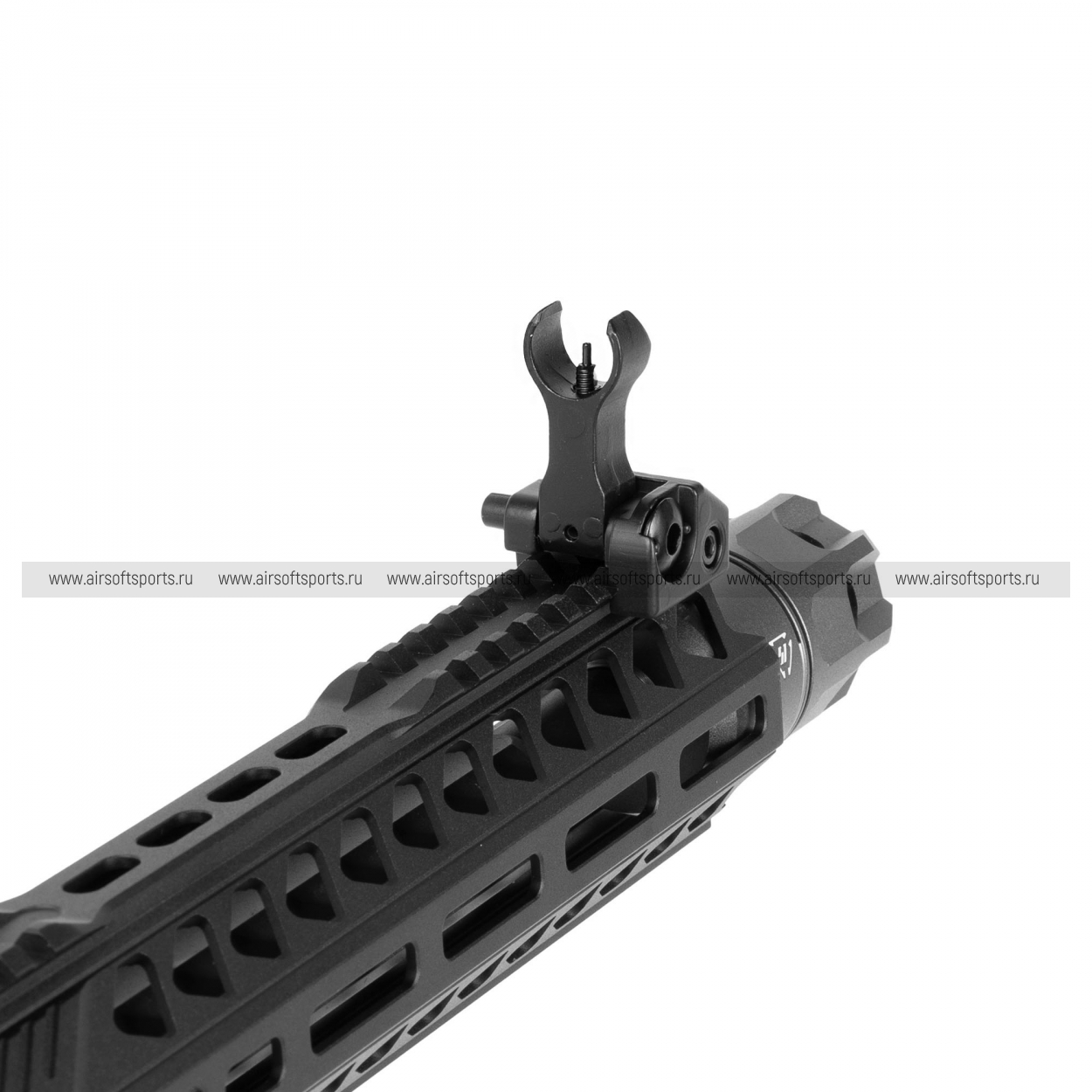 Cyma CQB PWS.002-10 (10 inch) выглядит как полноразмерный «PCC‑карабин» на базе AR‑платформы, вытянутый и визуально более «винтовочный», чем короткие CQB‑версии. Модель выполнена в матовом чёрном цвете; по всей верхней линии от ствольной коробки до конца цевья тянется сплошная планка Picatinny, на которой установлены складные механические прицелы. Длинное цевьё формата M‑LOK имеет характерные диагональные окна и агрессивную геометрию, а на дульной части установлен массивный компенсатор/пламегаситель с крупными боковыми прорезями, добавляющий «спортивно‑тактический» акцент.