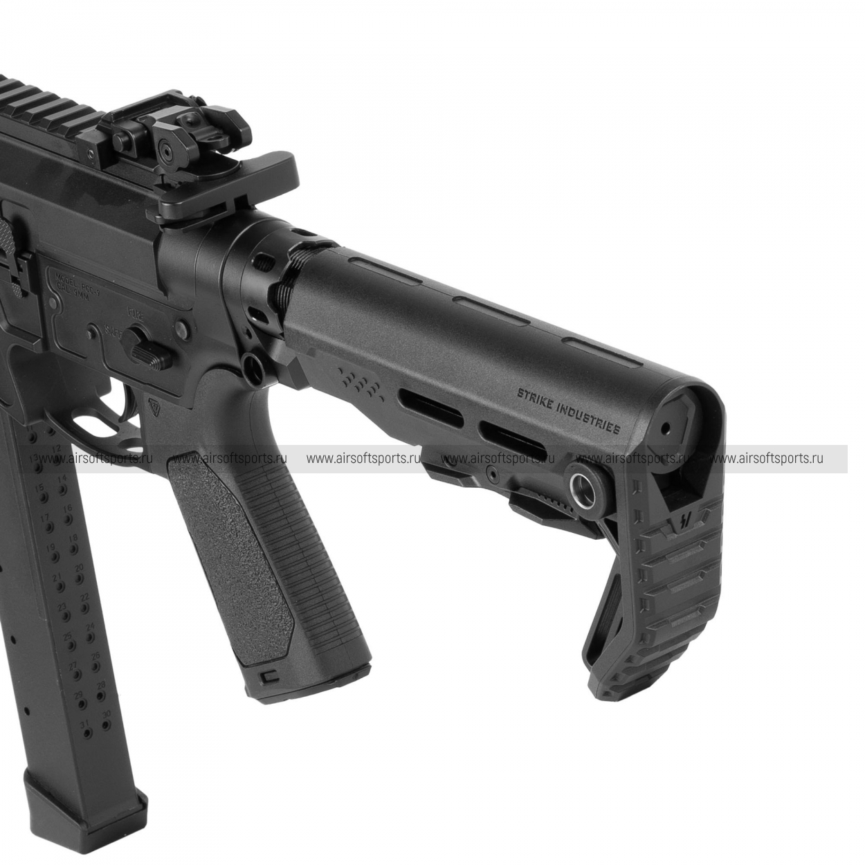 В центральной части хорошо узнаётся компоновка AR: прямоугольная ствольная коробка с органами управления, увеличенная спусковая скоба и рельефная пистолетная рукоять. Магазин — длинный, узкий, прямой «стик» под 9‑мм формат, заметно выступает вниз и сразу выдаёт принадлежность к PCC‑классу. Сзади стоит телескопический приклад на буферной трубе с развитым затыльником и характерными вырезами, благодаря чему оружие смотрится собранным и сбалансированным, рассчитанным на динамику и удобную установку навесного оборудования.