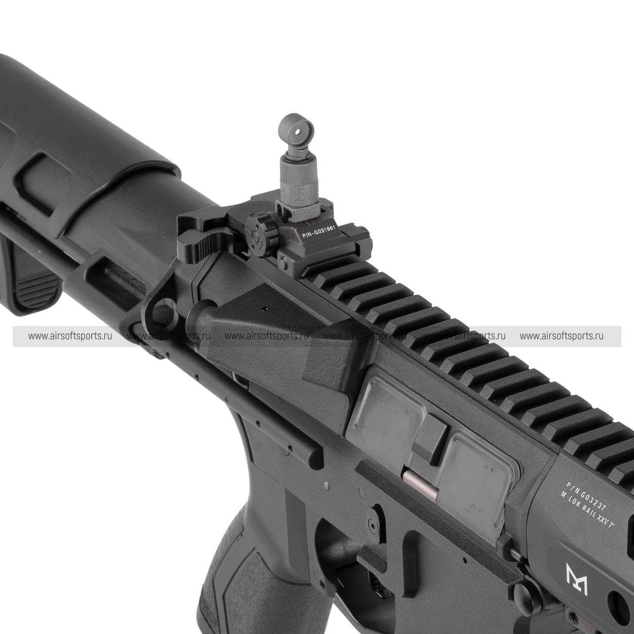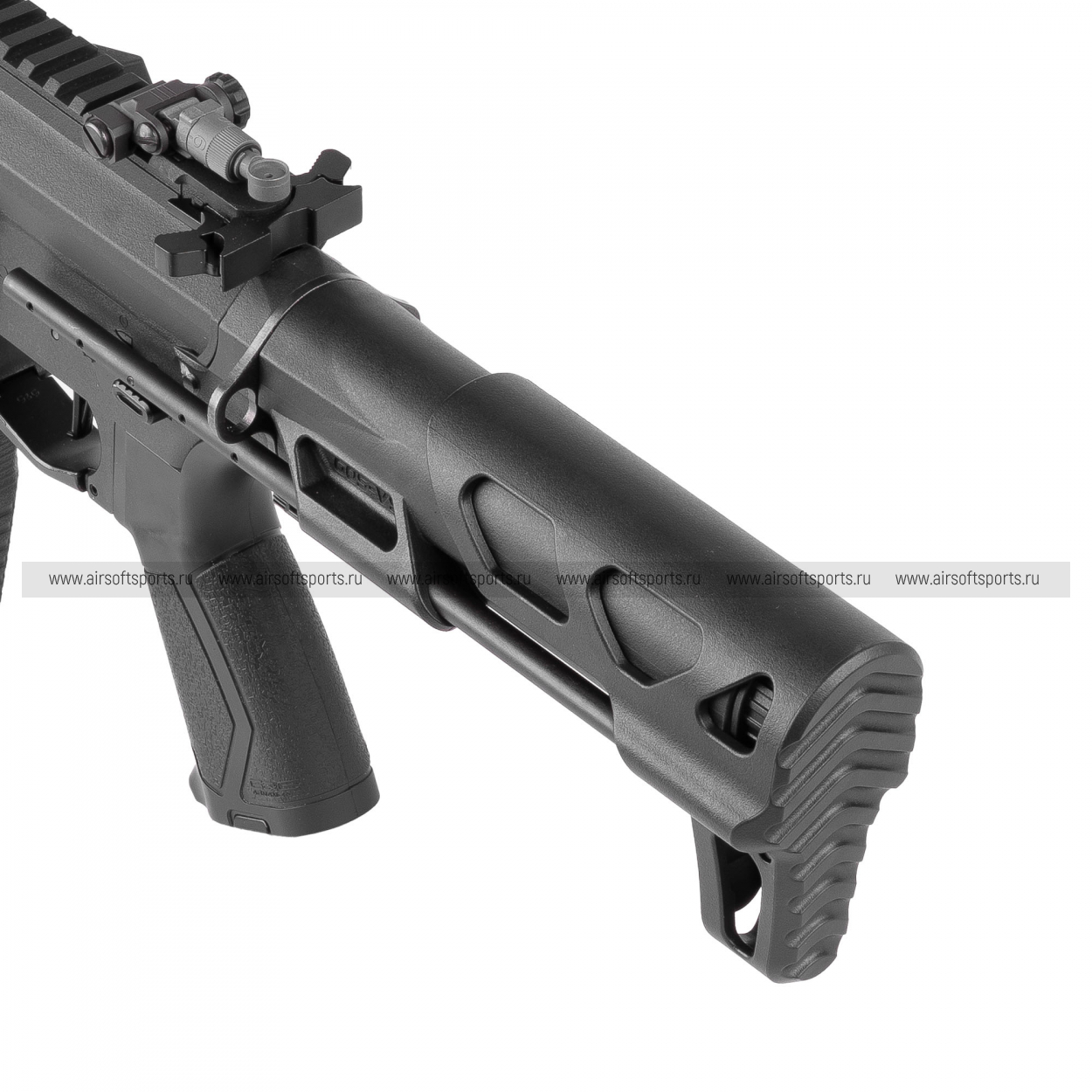 ARP 556 2.0 выглядит стильно, современно и очень динамично. Полностью черное исполнение подчеркивает его тактический характер, а укороченная конструкция делает силуэт компактным и собранным. Облегчённое цевьё с крупными прорезями визуально добавляет модели легкости, длинная верхняя планка делает профиль цельным, а складные прицельные приспособления органично дополняют общий образ. Отдельного внимания заслуживает вытянутый телескопический приклад с выразительными вырезами — он делает внешний вид автомата более спортивным и современным. В целом модель смотрится практично, аккуратно и очень эффектно.