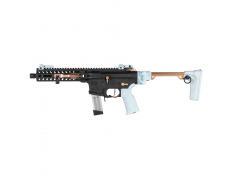 ARP9 2.0 выглядит очень современно, стремительно и агрессивно. Компактная передняя часть с облегчённым цевьём и крупными геометричными вырезами делает силуэт легким и динамичным, а длинная верхняя планка визуально объединяет всю конструкцию. Низкопрофильные складные прицельные приспособления аккуратно вписываются в общий образ, а укороченное дульное устройство подчеркивает штурмовой характер модели. Отдельного внимания заслуживает вытянутый магазин формата пистолет-пулемёта — он сразу выделяет привод на фоне классических AR-платформ и делает внешний вид более оригинальным. Телескопический приклад с современным облегчённым дизайном и эргономичная пистолетная рукоять завершают образ, делая модель стильной, компактной и очень актуальной по внешнему исполнению.