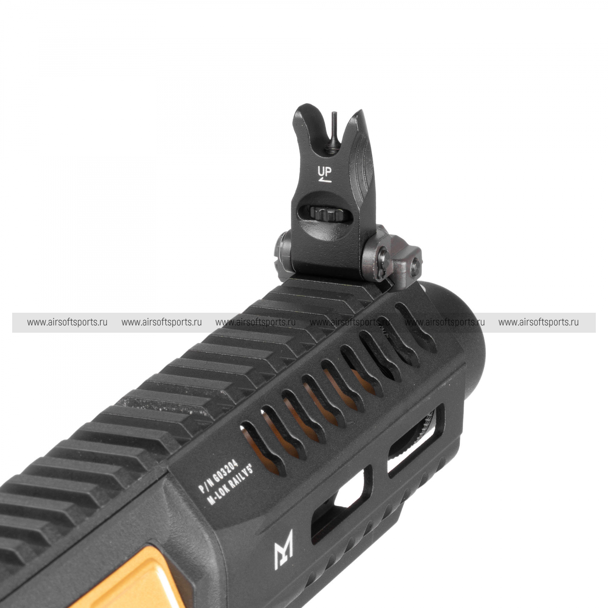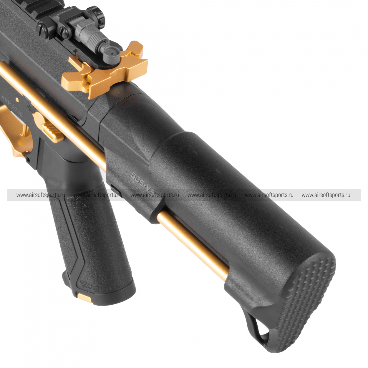 ARP9 Stealth Gold выглядит очень эффектно, дерзко и заметно более броско, чем классические версии модели. Основа в черном цвете создает строгий фон, на котором особенно ярко выделяются золотистые элементы — они присутствуют в области органов управления, декоративных деталях корпуса, приклада и спусковой зоны, придавая приводу выраженный кастомный характер. Короткое цевьё с фирменными прорезями сохраняет компактный и агрессивный силуэт, а длинный прямой магазин формата пистолет-пулемёта сразу делает модель узнаваемой. Верхняя планка и складные прицельные приспособления подчеркивают тактическую основу конструкции, а общее сочетание черного и золота делает внешний вид особенно стильным, смелым и запоминающимся.