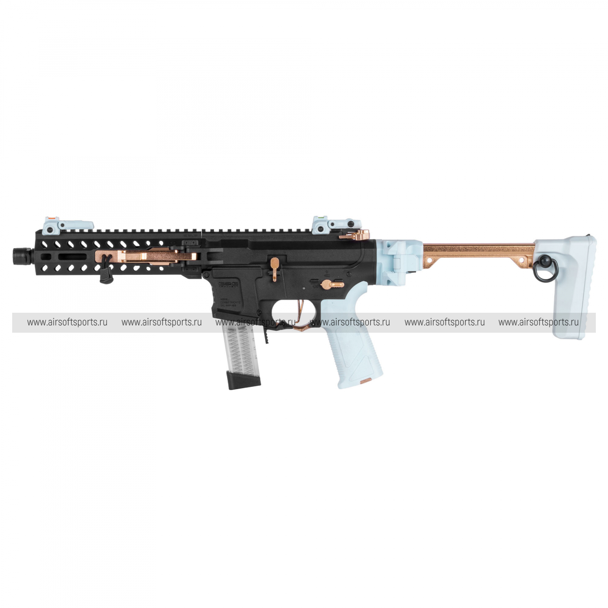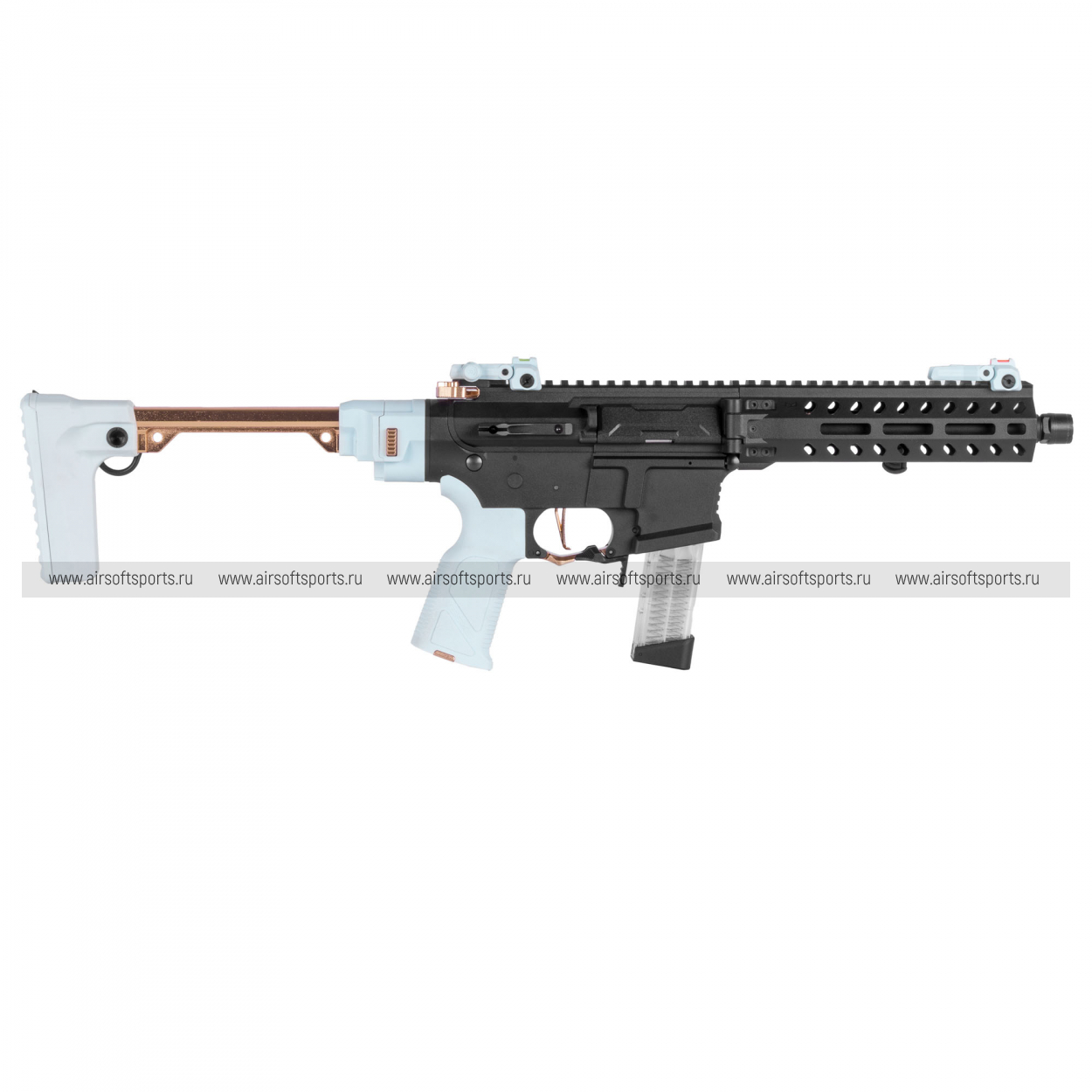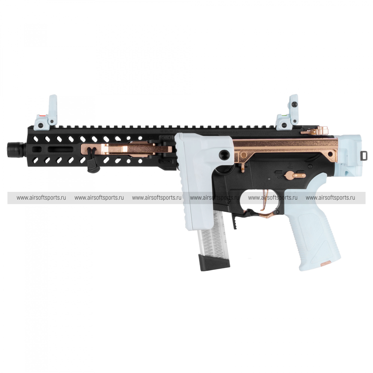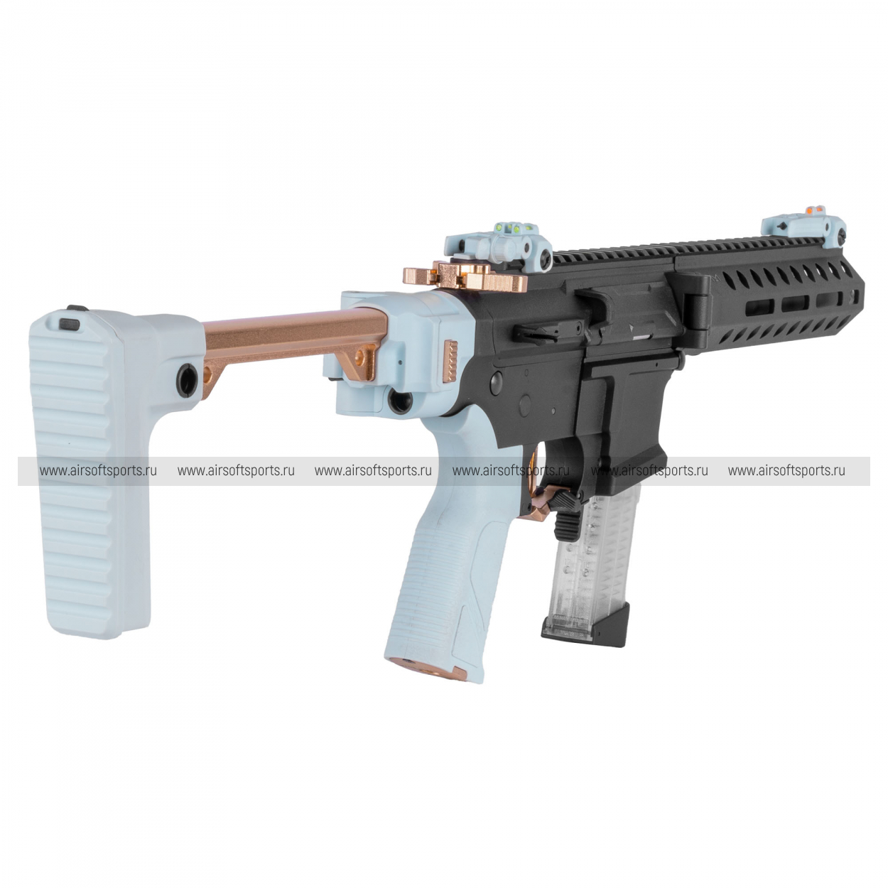 Особенность: Ключевой особенностью G&G FAR9 Macaron Blue является его компактность. Для достижения максимальной мобильности в пистолете-пулемете реализована конструкция, позволяющая сложить его сразу в двух местах. В данном случае помимо приклада, складывается также цевье. В полностью сложенном положении девайс имеет длину не более 25 см, поэтому его удобно транспортировать и хранить.