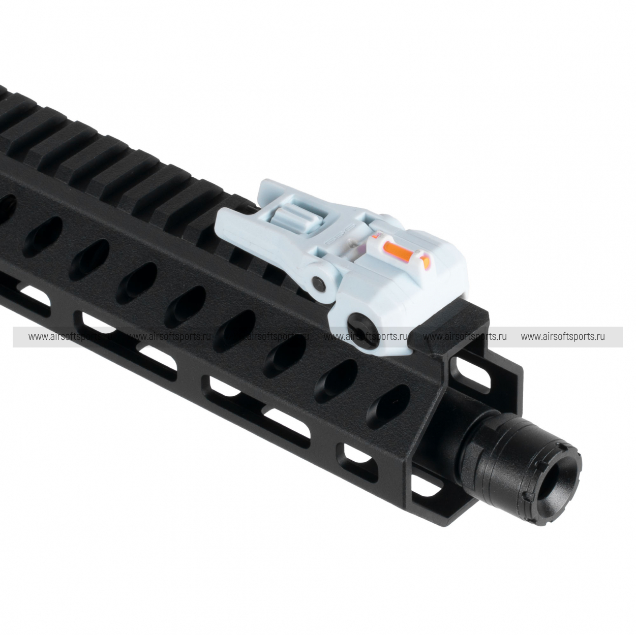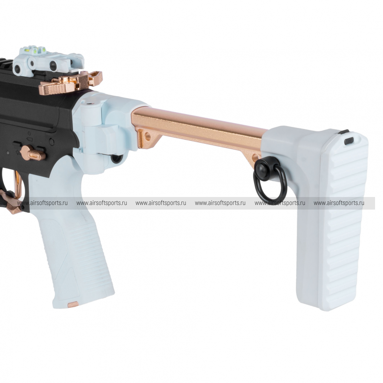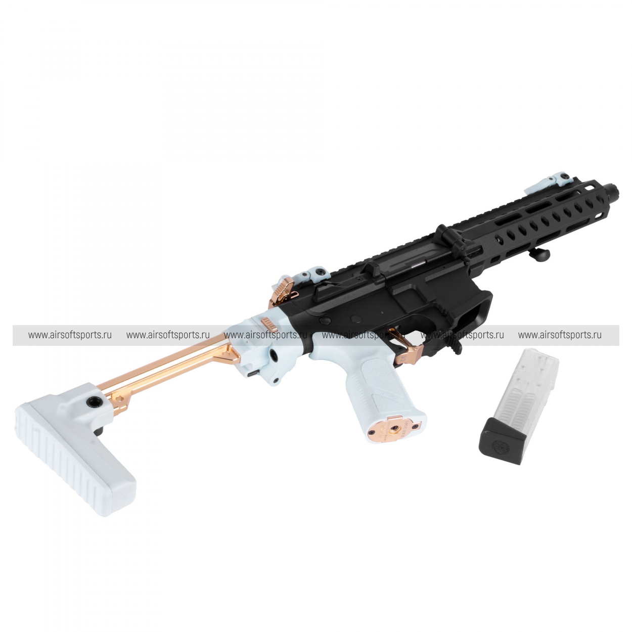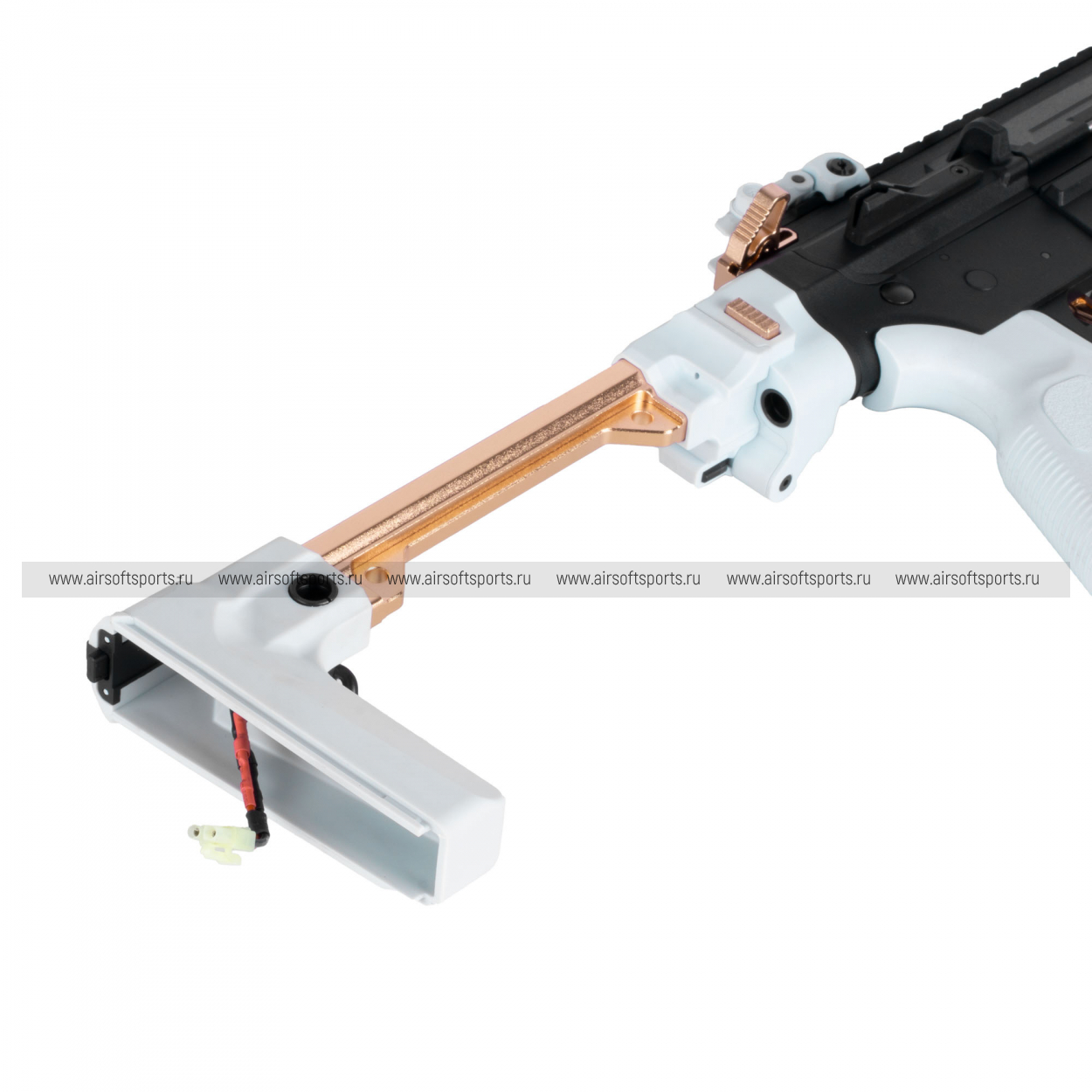 Автомат оснащен складным прикладом, который позволяет регулировать длину оружия в зависимости от предпочтений стрелка и условий игры. Это обеспечивает комфортное использование как в ближнем, так и в дальнем бою. А для удобства транспортировки и хранения, можно дополнительно сложить цевье и убрать девайс, например, в такитический рюкзак.