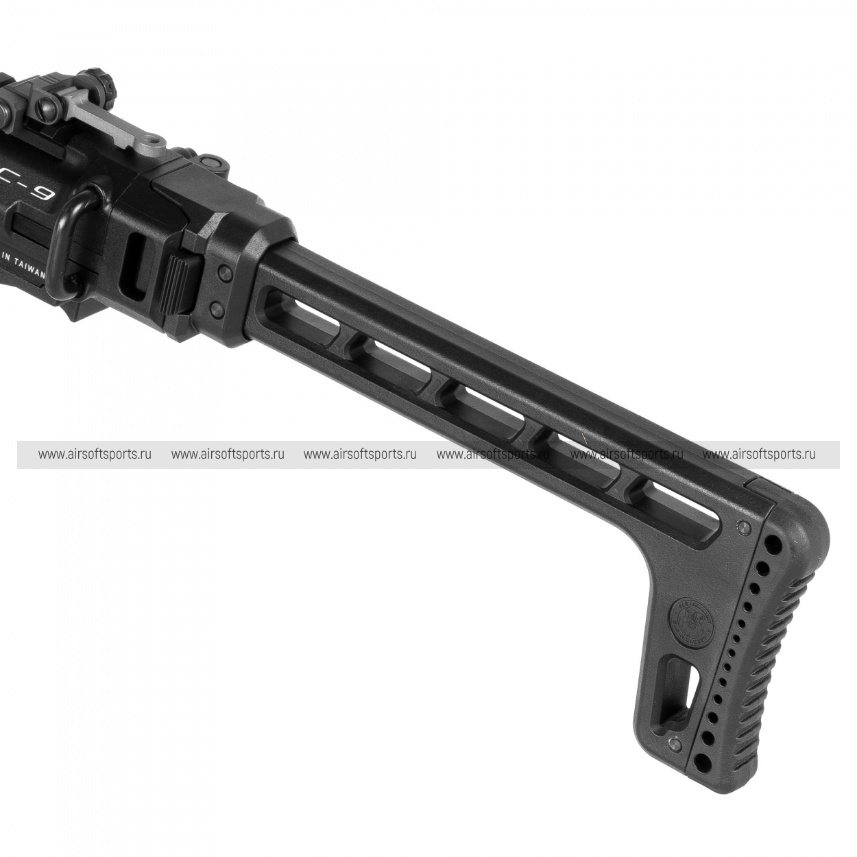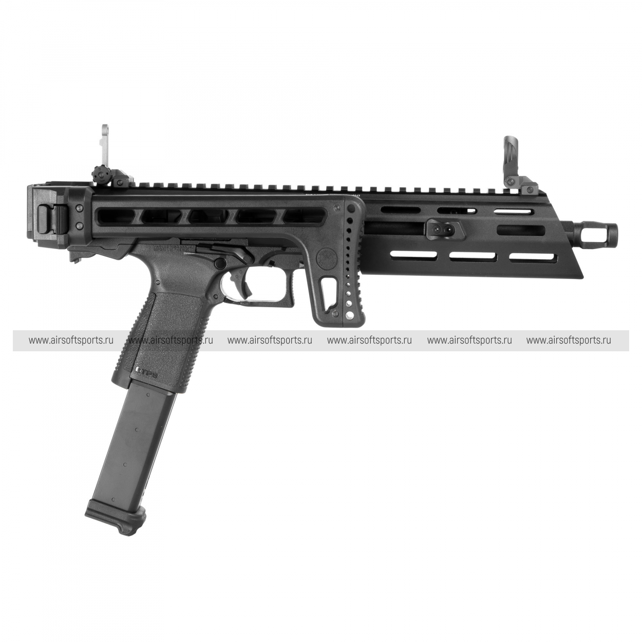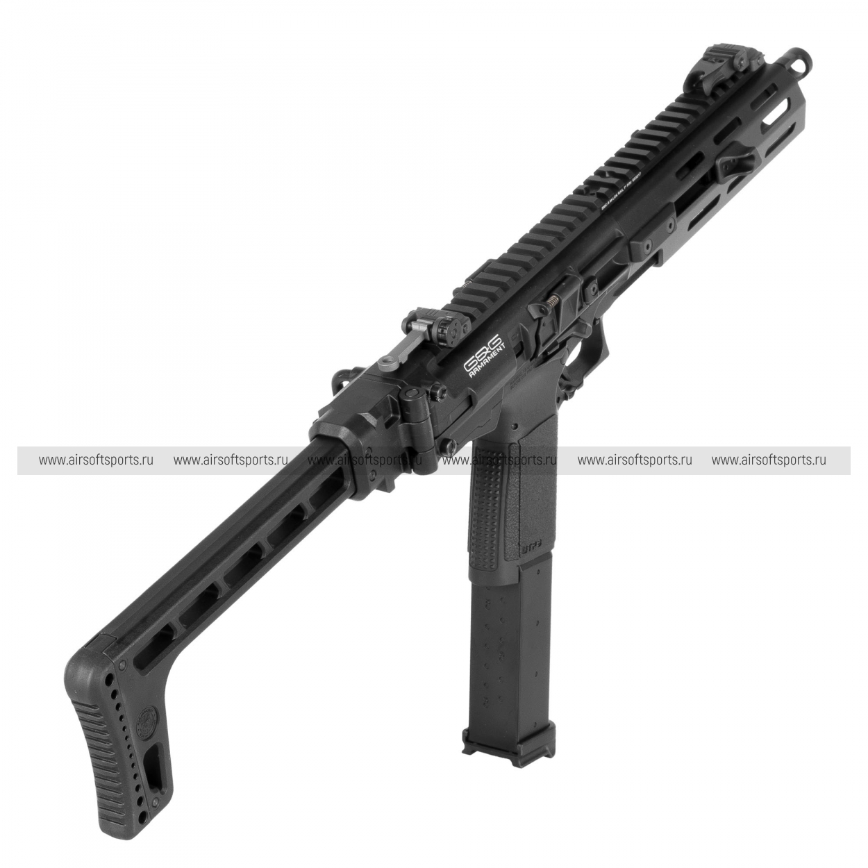 SMC-9 выглядит очень современно, агрессивно и необычно. Полностью черное исполнение подчеркивает его тактический характер, а вытянутый верхний профиль с длинной планкой и облегчёнными элементами корпуса делает силуэт стремительным и технологичным. Особенно выделяются скелетный складной приклад, компактная пистолетная рукоять и длинный прямой магазин, которые придают модели характерный облик пистолета-пулемёта нового поколения. Благодаря сочетанию острых линий, прорезей в цевье и компактной компоновки реплика выглядит стильно, легко и очень эффектно.