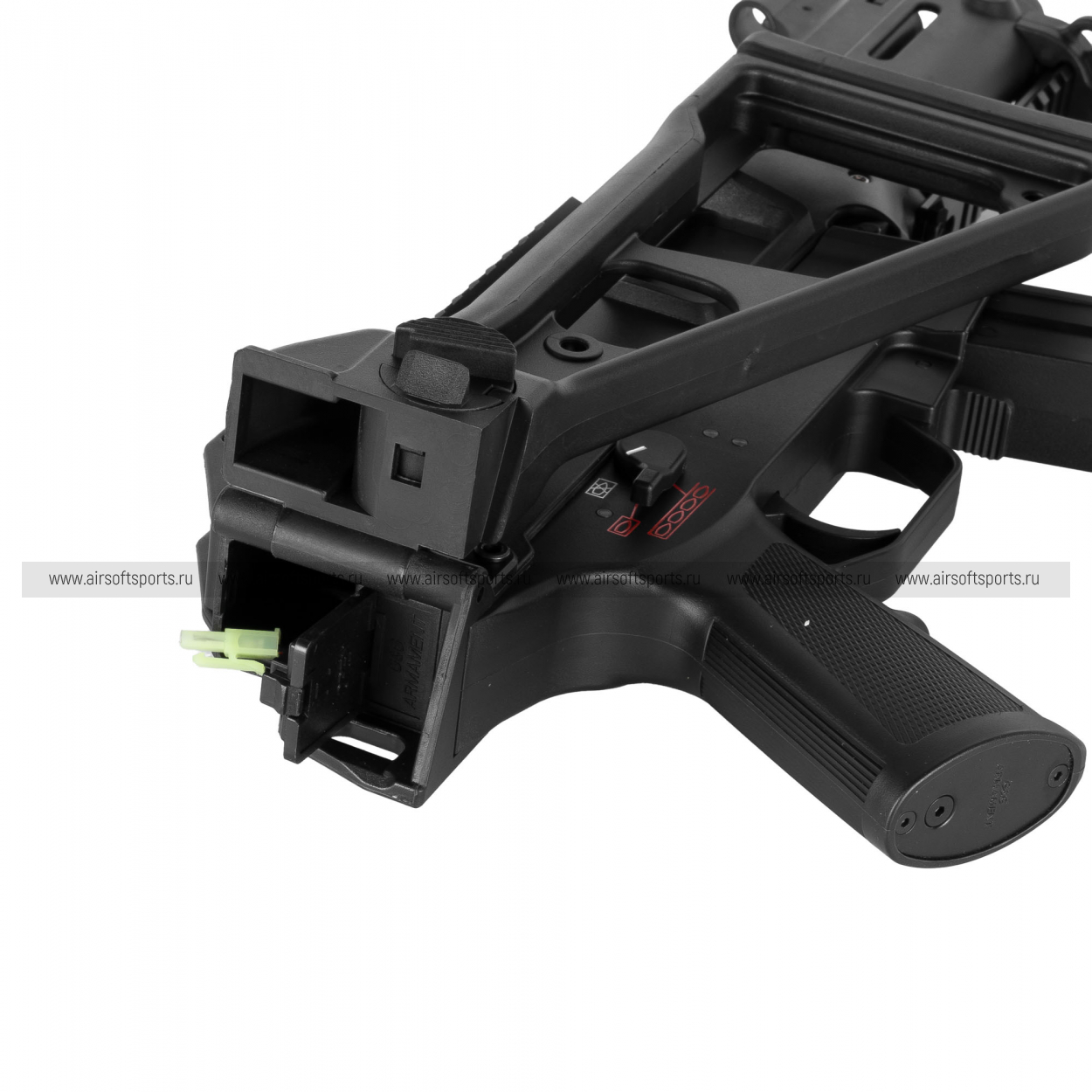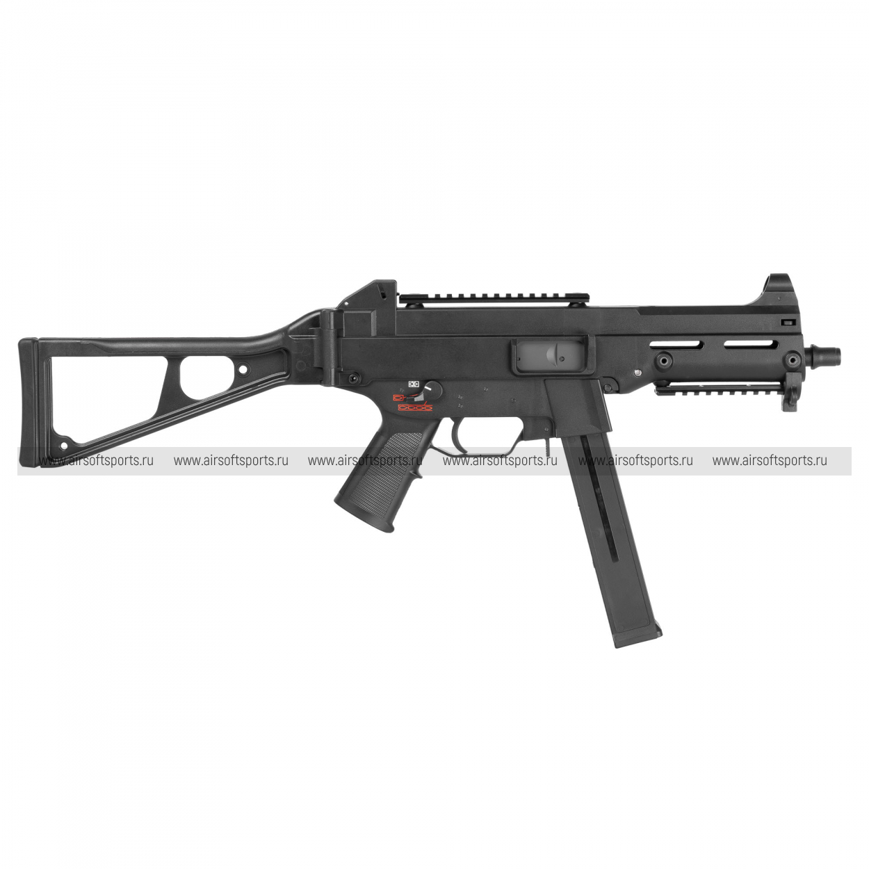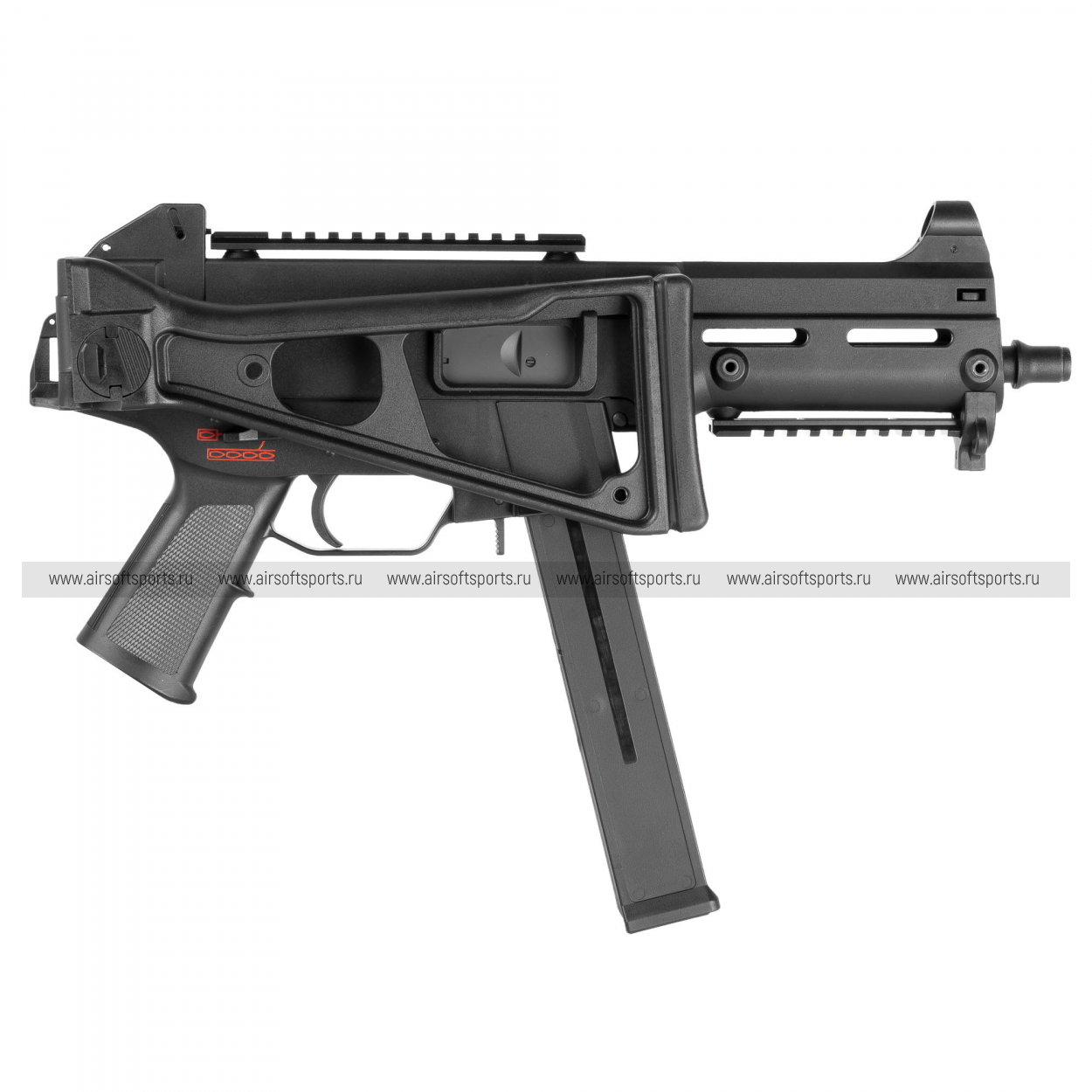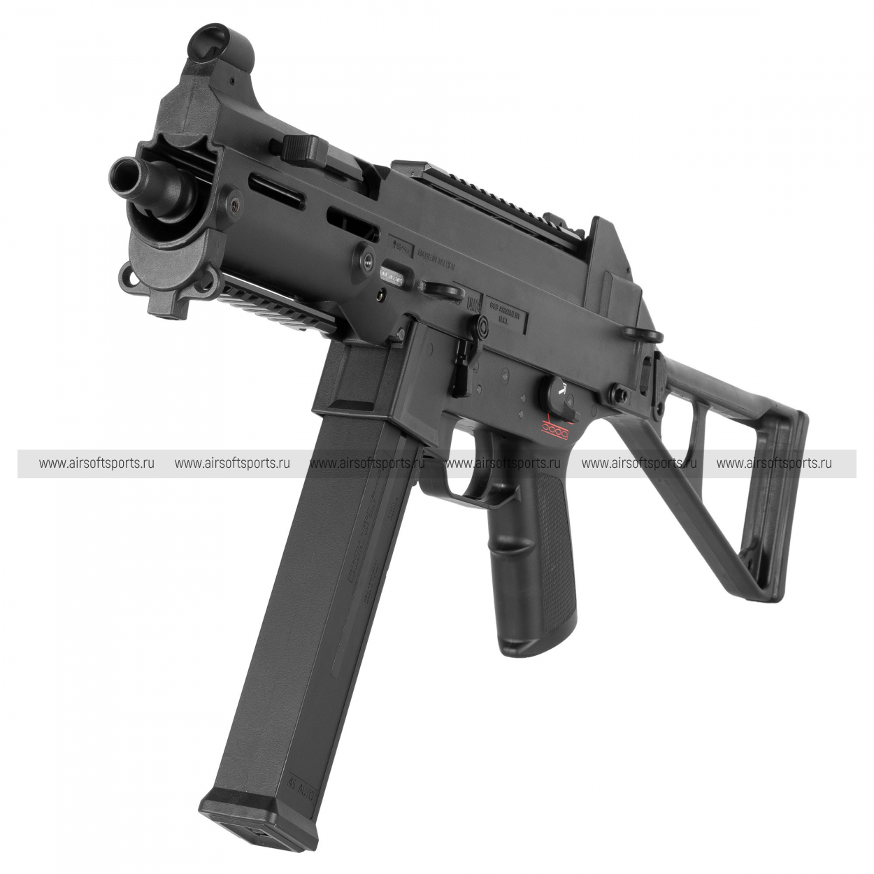 UMG выглядит строго, компактно и очень характерно. Его силуэт легко узнаётся благодаря массивному полимерному корпусу, высокой линии верхней части, прямому магазину и фирменному складному рамочному прикладу. Передняя часть оформлена лаконично и функционально: короткое цевьё с продолговатыми прорезями и нижней планкой делает модель более тактической, но при этом не перегружает внешний вид. Верхняя планка аккуратно интегрирована в корпус и подчеркивает современный утилитарный стиль. Пистолетная рукоять имеет простую, удобную форму, а общая геометрия привода создает впечатление надежной, практичной и компактной платформы.