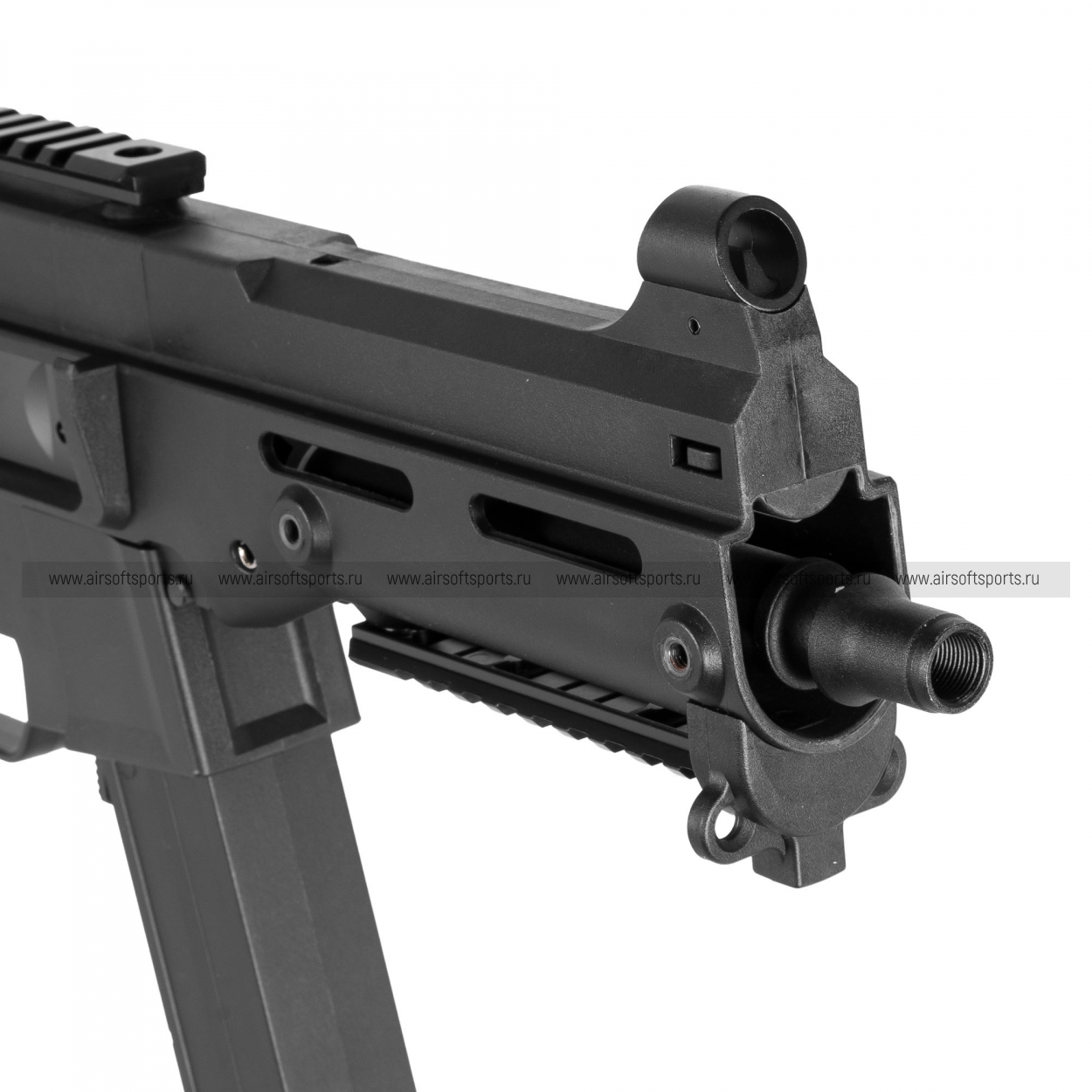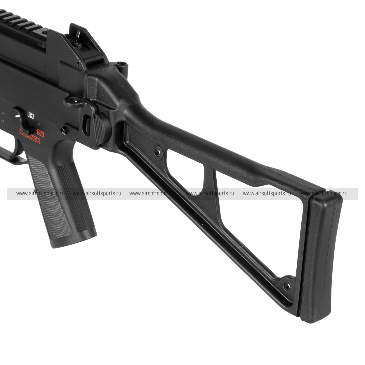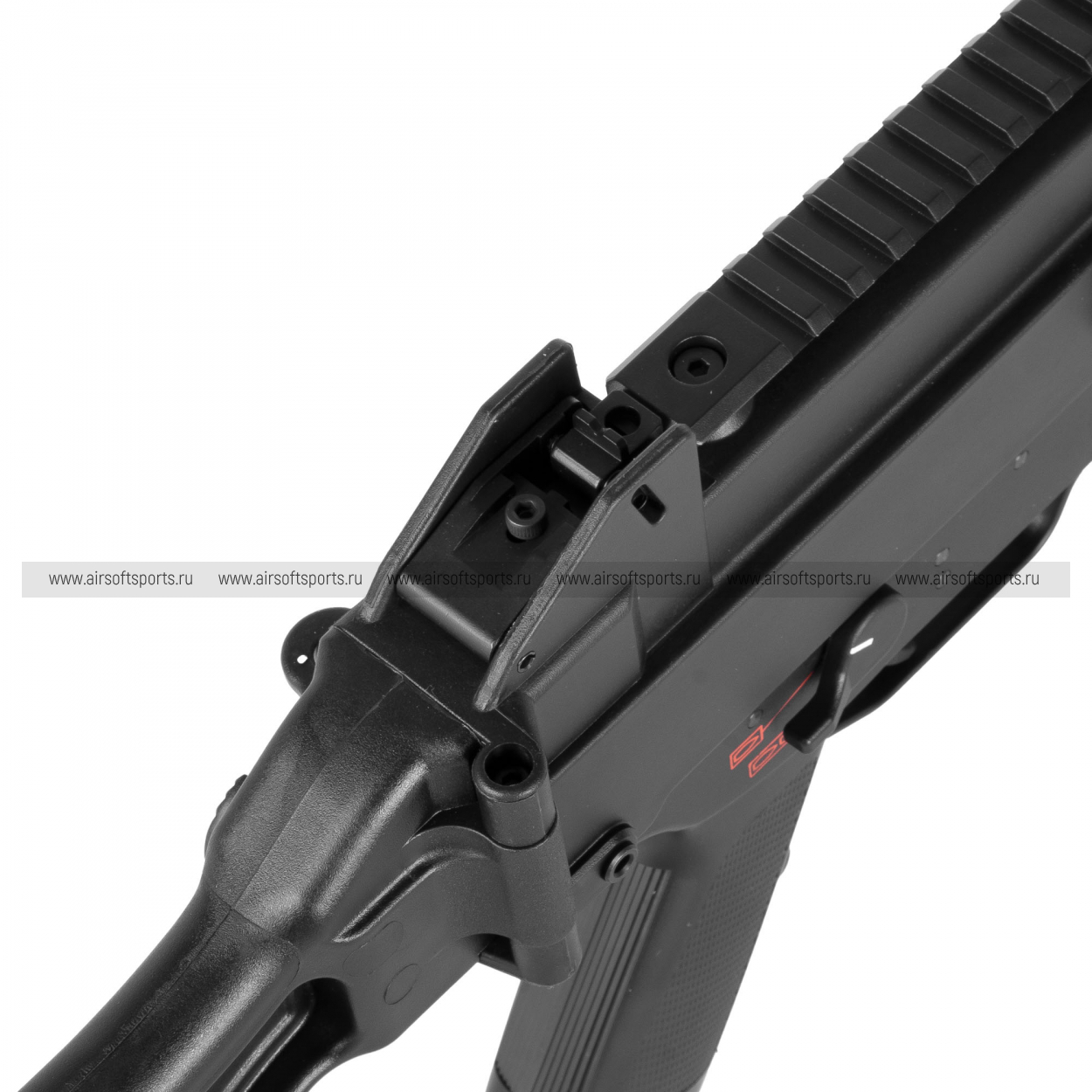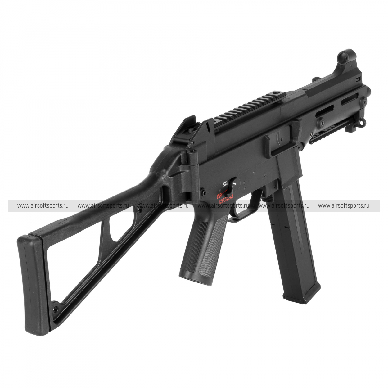 UMG выглядит строго, компактно и очень характерно. Его силуэт легко узнаётся благодаря массивному полимерному корпусу, высокой линии верхней части, прямому магазину и фирменному складному рамочному прикладу. Передняя часть оформлена лаконично и функционально: короткое цевьё с продолговатыми прорезями и нижней планкой делает модель более тактической, но при этом не перегружает внешний вид. Верхняя планка аккуратно интегрирована в корпус и подчеркивает современный утилитарный стиль. Пистолетная рукоять имеет простую, удобную форму, а общая геометрия привода создает впечатление надежной, практичной и компактной платформы.