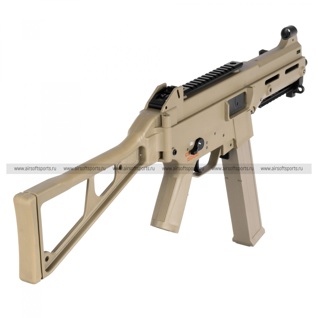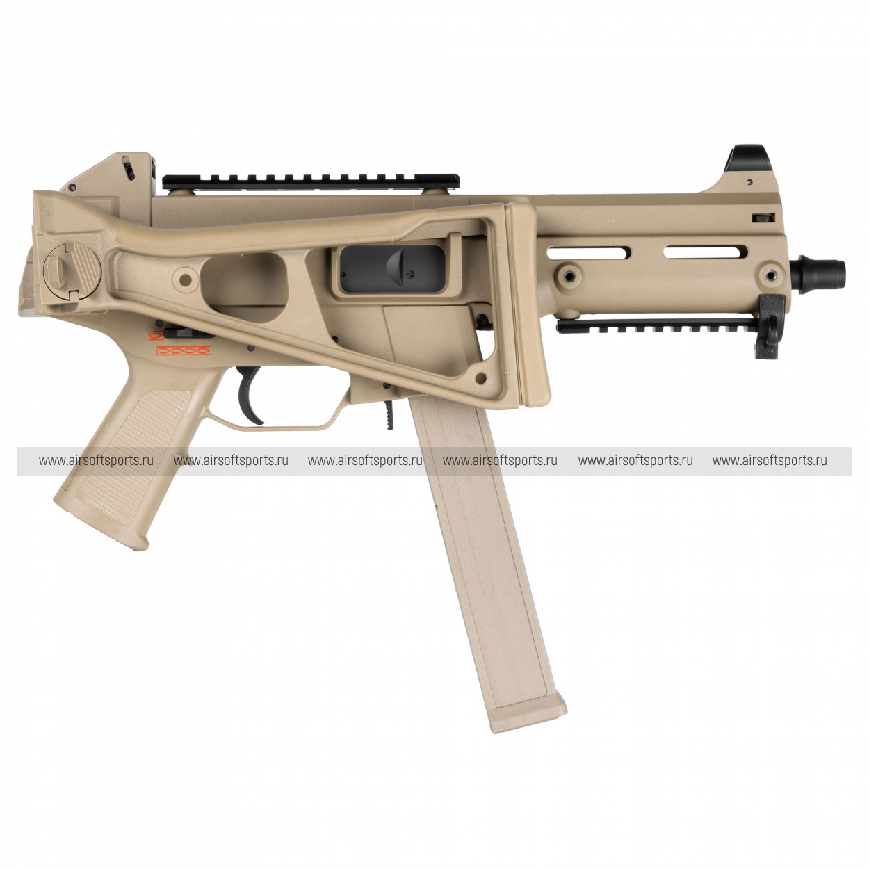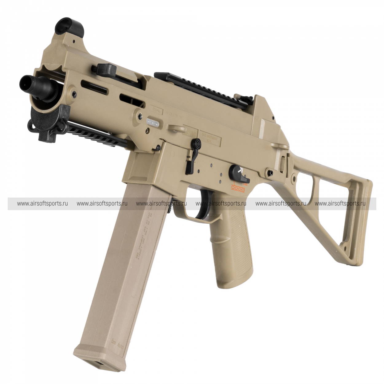 UMG выглядит строго, компактно и очень характерно. Его силуэт легко узнаётся благодаря массивному полимерному корпусу, высокой линии верхней части, прямому магазину и фирменному складному рамочному прикладу. Передняя часть оформлена лаконично и функционально: короткое цевьё с продолговатыми прорезями и нижней планкой делает модель более тактической, но при этом не перегружает внешний вид. Верхняя планка аккуратно интегрирована в корпус и подчеркивает современный утилитарный стиль. Пистолетная рукоять имеет простую, удобную форму, а общая геометрия привода создает впечатление надежной, практичной и компактной платформы.