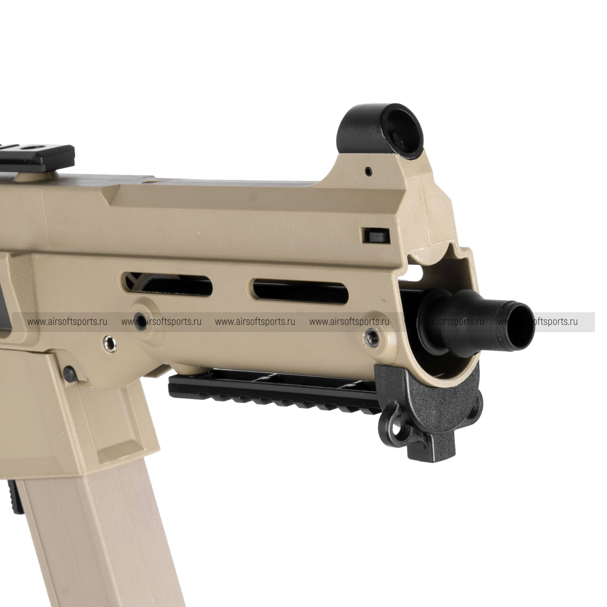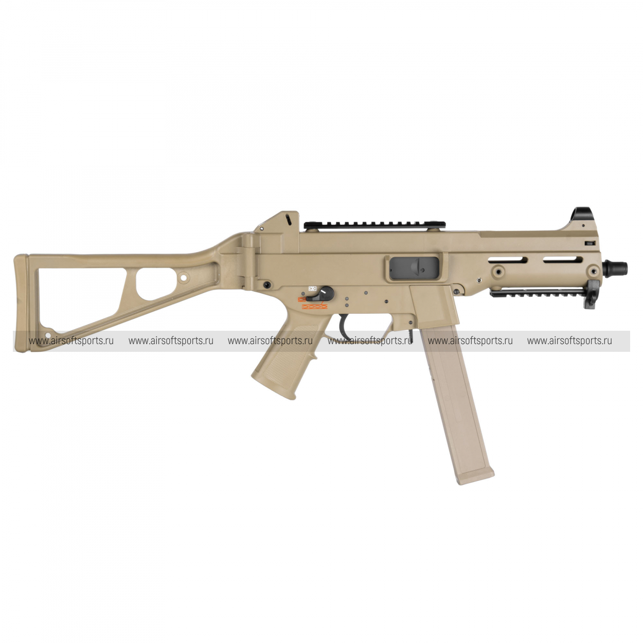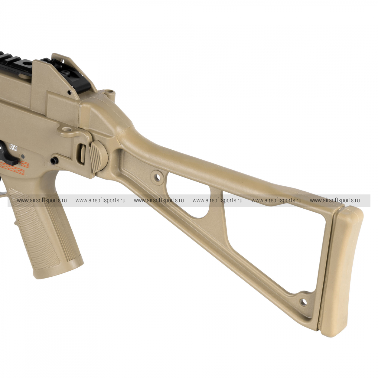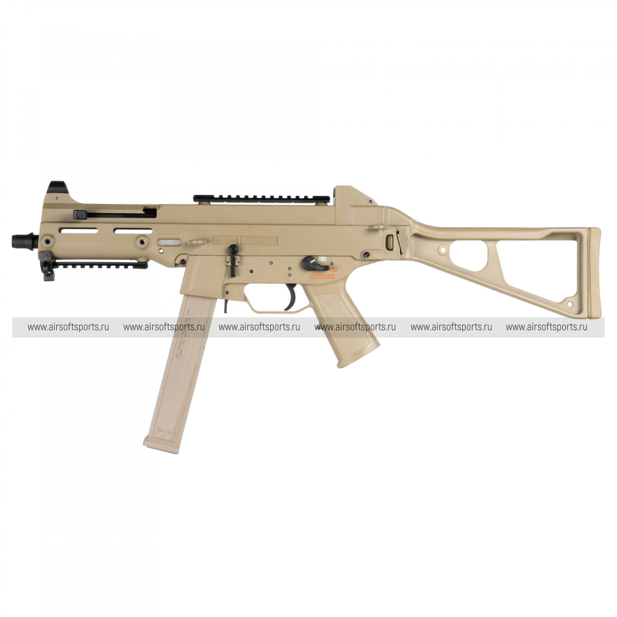 UMG выглядит строго, компактно и очень характерно. Его силуэт легко узнаётся благодаря массивному полимерному корпусу, высокой линии верхней части, прямому магазину и фирменному складному рамочному прикладу. Передняя часть оформлена лаконично и функционально: короткое цевьё с продолговатыми прорезями и нижней планкой делает модель более тактической, но при этом не перегружает внешний вид. Верхняя планка аккуратно интегрирована в корпус и подчеркивает современный утилитарный стиль. Пистолетная рукоять имеет простую, удобную форму, а общая геометрия привода создает впечатление надежной, практичной и компактной платформы.