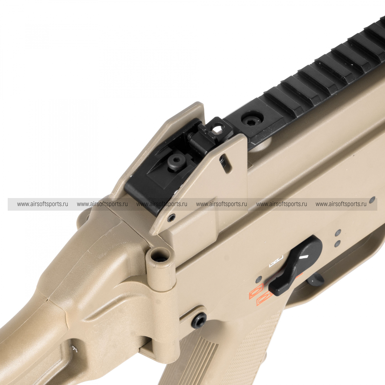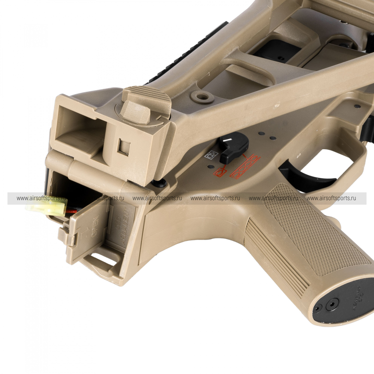 Отсек для аккумулятора находится в верхней части ствольной коробки. Доступ к нему открывается при складывании приклада и открытии задней шторки. Пространство рассчитано на установку длинных Li-Po аккумуляторов типа «стик»
