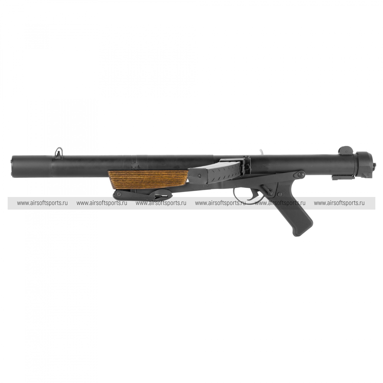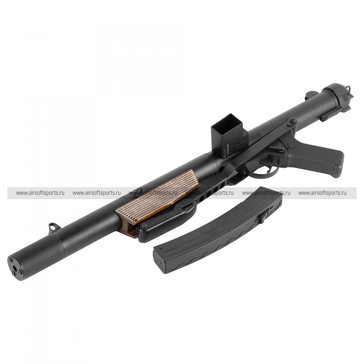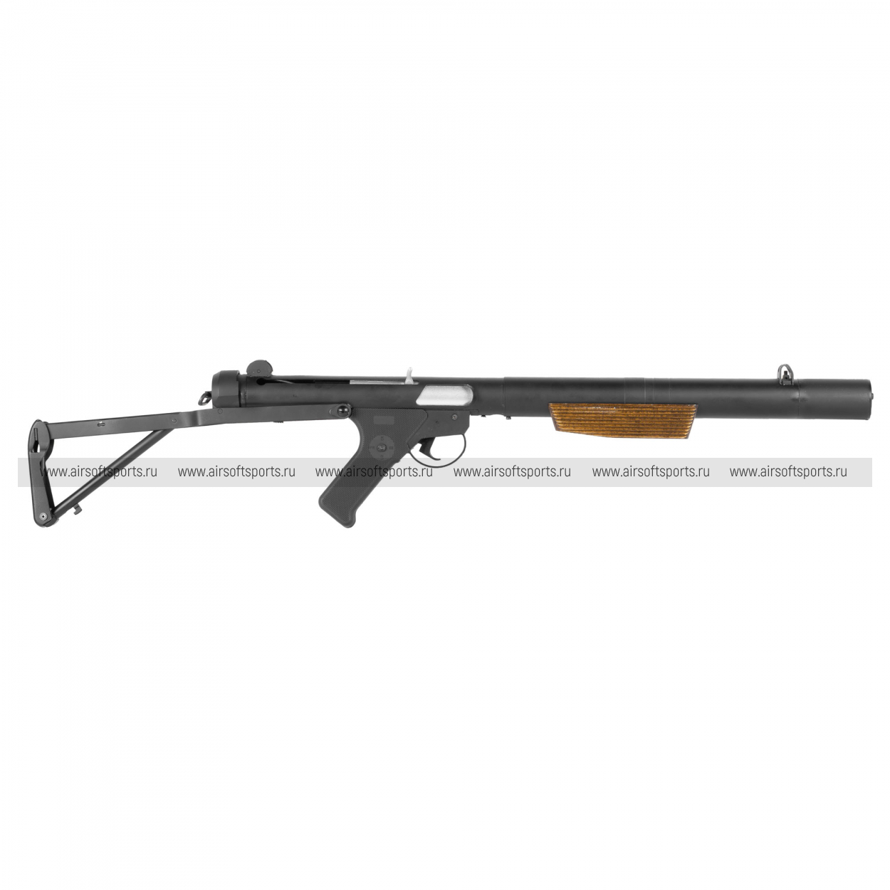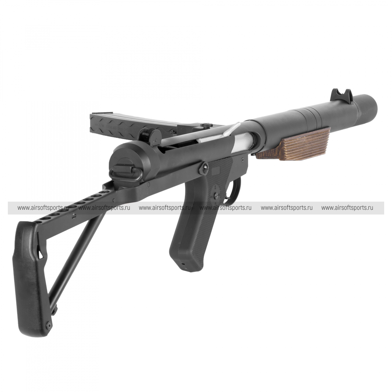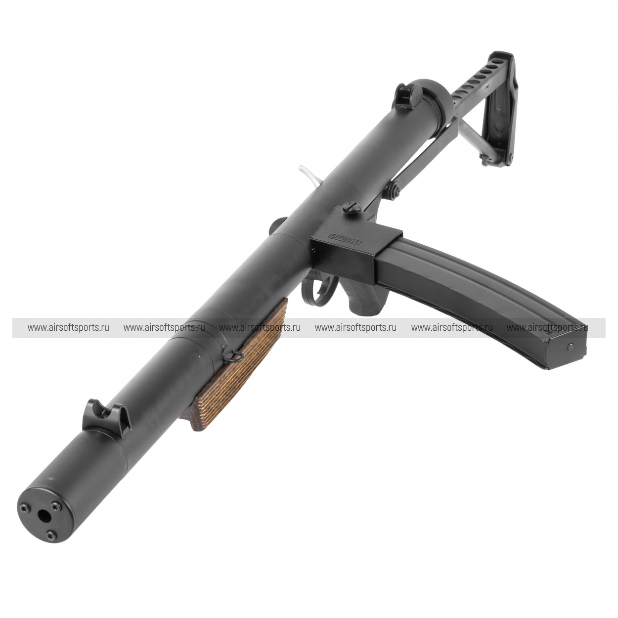 Внешне MK5 (L34A1) сразу выделяется длинным интегрированным глушителем, который задаёт вытянутый силуэт и «спецподразделенческий» стиль. Корпус выполнен в строгом матовом чёрном металле и выглядит цельно и брутально, без лишних деталей. Фирменная черта Sterling — магазин сбоку — делает профиль нестандартным и легко узнаваемым. Дополняют образ складной проволочный приклад и деревянная накладка (Real Wood) на цевье: тёплая фактура дерева эффектно контрастирует с холодным металлом и добавляет модели премиальный, «оружейный» вид.