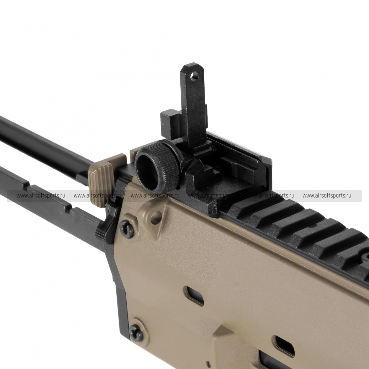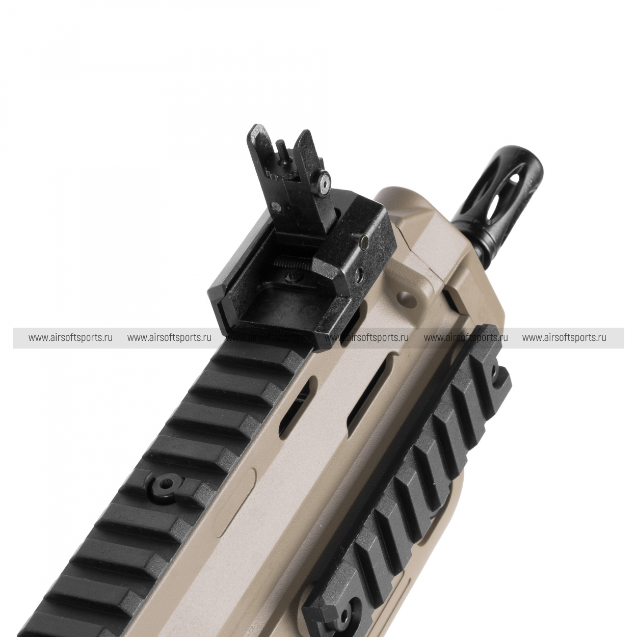 На верхней части корпуса располагается планка стандарта Picatinny / 20 мм, на которую можно установить коллиматорный прицел или другие оптические аксессуары. В комплекте идут складывающиеся механические прицельные приспособления: откидная мушка и целик, которые в сложенном виде не мешают установке оптики, а в поднятом состоянии обеспечивают быструю прицельную наводку. Боковые участки и нижняя часть цевья также имеют интерфейс для установки тактического фонаря, ЛЦУ, вертикальной рукояти и других аксессуаров, что позволяет адаптировать привод под разные сценарии игры и личные предпочтения по хвату.