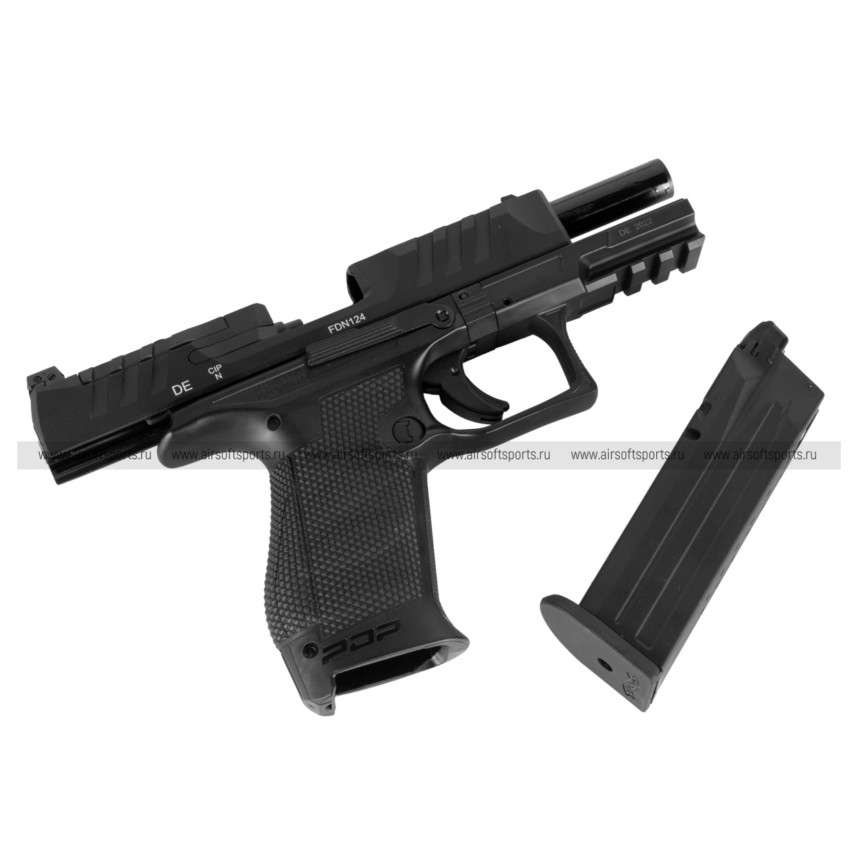 Корпус пистолета выполнен в классической для современных боевых Walther PDP компоновке: полимерная рама с металлическим затвором. Затвор изготовлен из металла, имеет характерные агрессивные насечки спереди и сзади для удобного перезаряжания и проверки патронника, а также характерный профиль PDP. На раме находится стандартная нижняя планка Picatinny (accessory rail) для установки тактических аксессуаров, таких как фонарь или лазерный целеуказатель. Пистолет рассчитан на формат компактного боевого оружия – укороченный 4‑дюймовый ствол обеспечивает баланс между компактностью и управляемостью, что в страйкболе делает его удобным как основное, так и резервное оружие