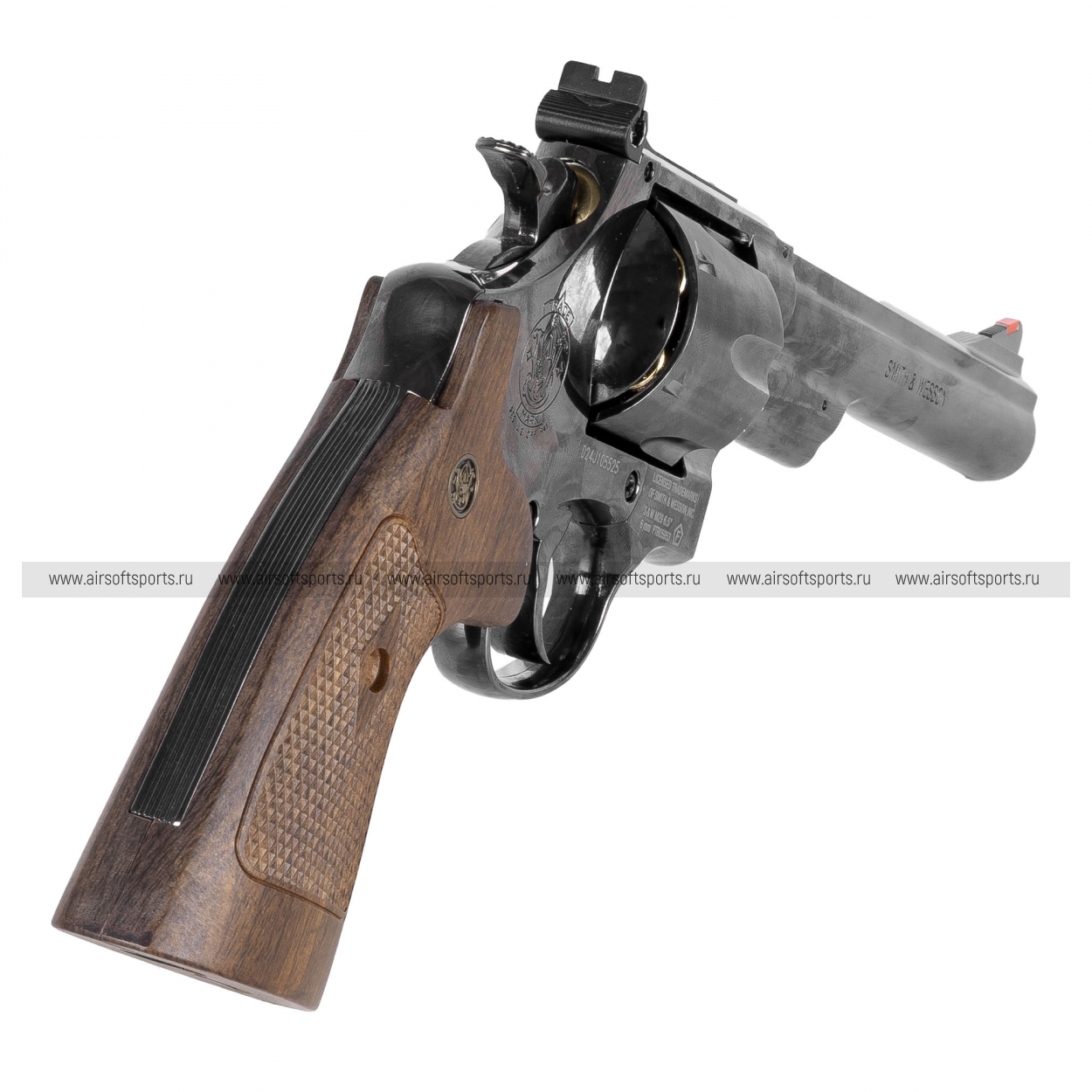 Страйкбольный револьвер работает на углекислом газе (CO2), что в сочетании с длинным стволом обеспечивает высокую начальную скорость вылета шара и стабильную работу механизмов даже при низких температурах. Модель выполнена по лицензии Smith & Wesson в эффектном цвете Titanium Black.