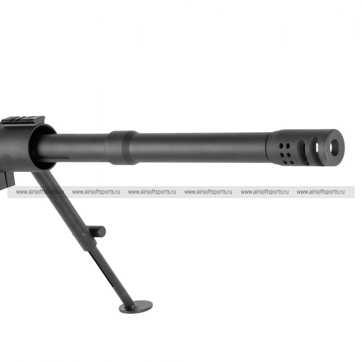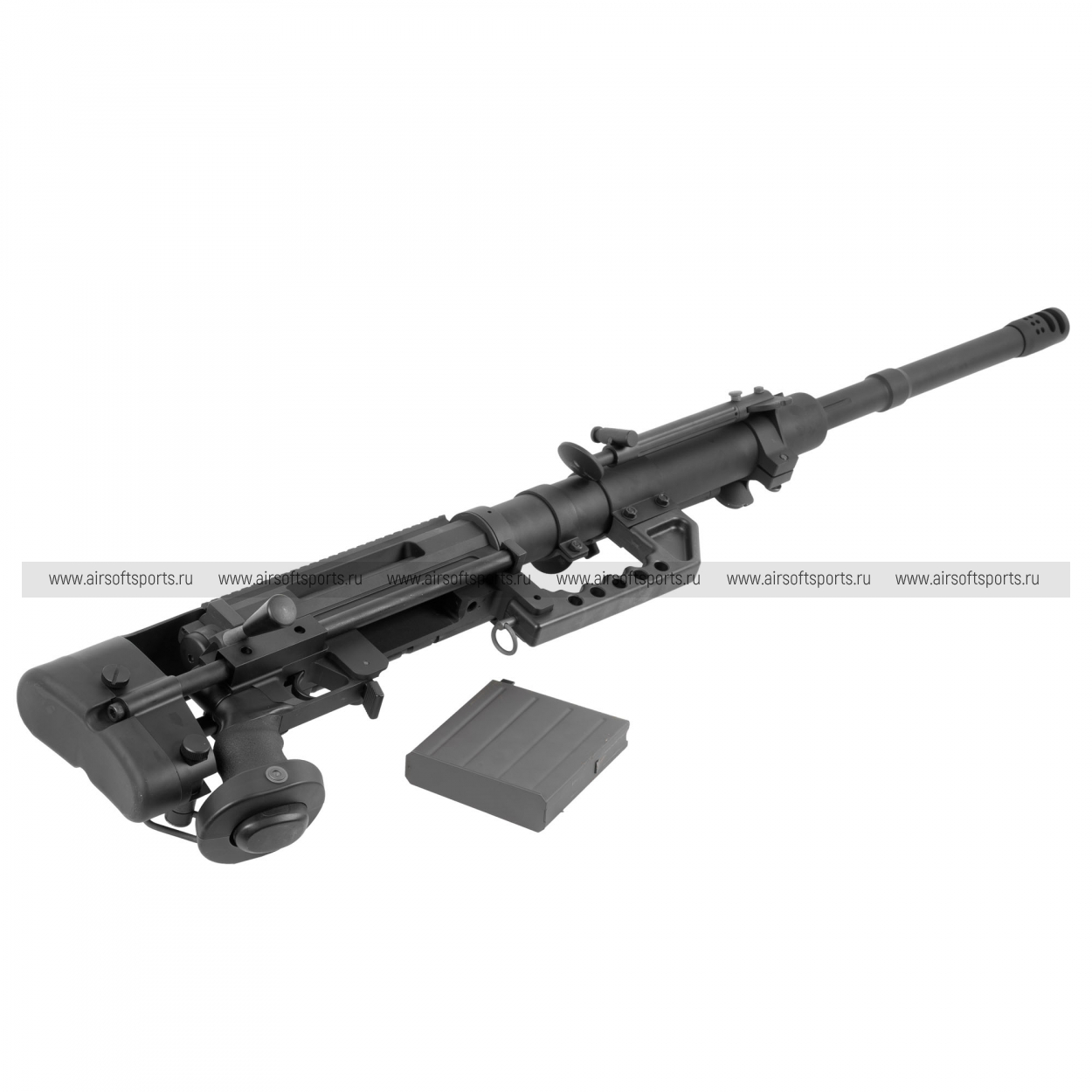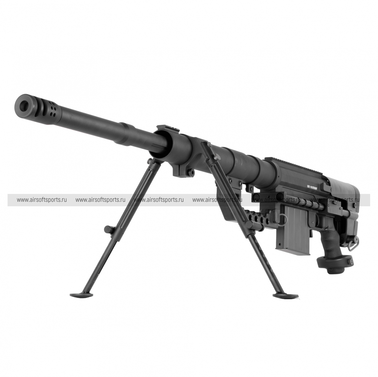 M200 производит впечатление «тяжёлой» снайперской платформы: длинный ствол, массивная ствольная коробка и развитые элементы обвеса формируют мощный, узнаваемый образ. Винтовка оснащена складными сошками, а также крупным скелетным прикладом с выраженными регулировками — всё выглядит строго и функционально. Сверху тянется длинная планка под оптику, подчёркивающая снайперский характер модели. В чёрном цвете винтовка смотрится максимально брутально и «тактически».
