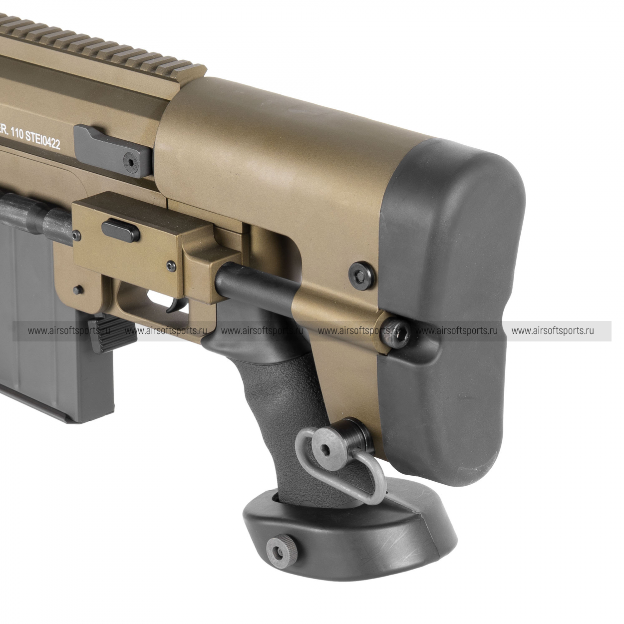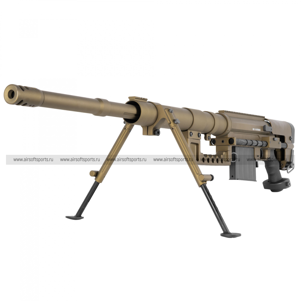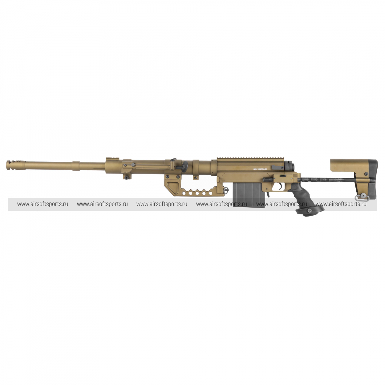 M200 производит впечатление «тяжёлой» снайперской платформы: длинный ствол, массивная ствольная коробка и развитые элементы обвеса формируют мощный, узнаваемый образ. Винтовка оснащена складными сошками, а также крупным скелетным прикладом с выраженными регулировками — всё выглядит строго и функционально. Сверху тянется длинная планка под оптику, подчёркивающая снайперский характер модели. В BR (песочном) цвете — это «полевой» и современно-армейской вариант, с эффектным контрастом отдельных тёмных элементов.