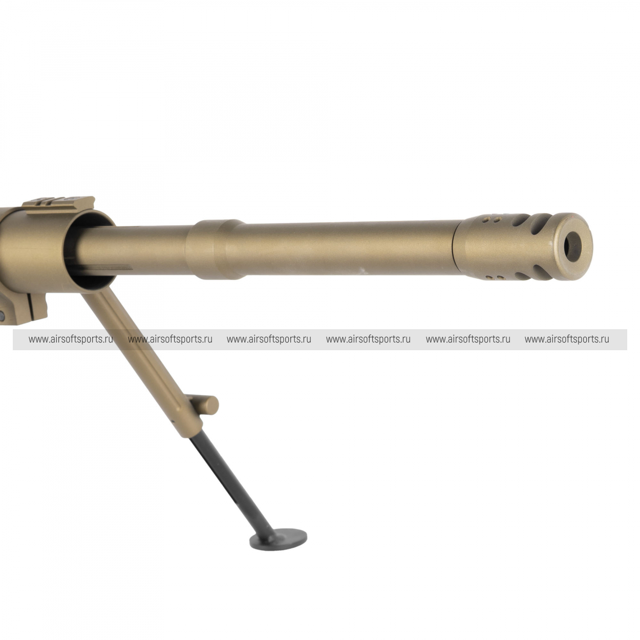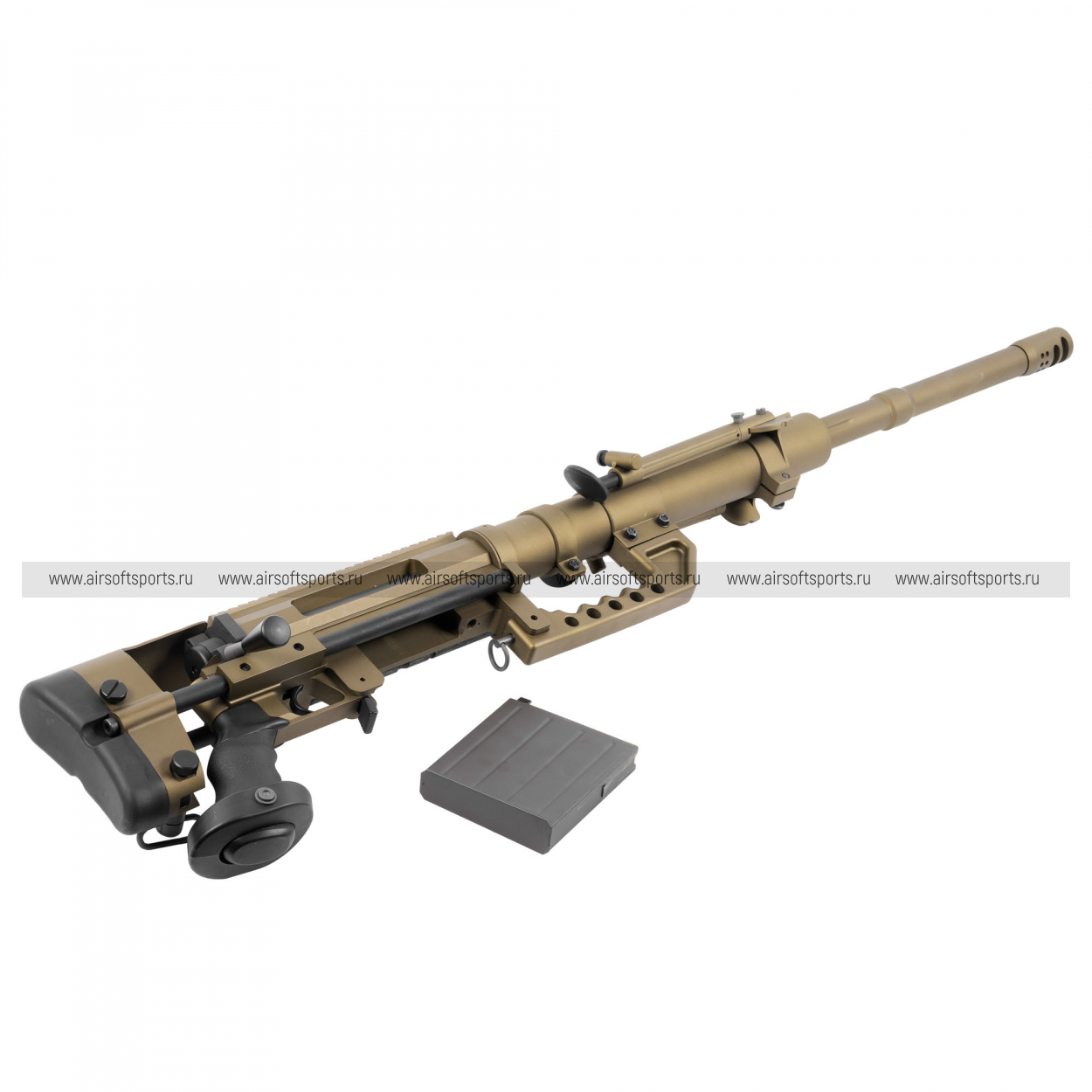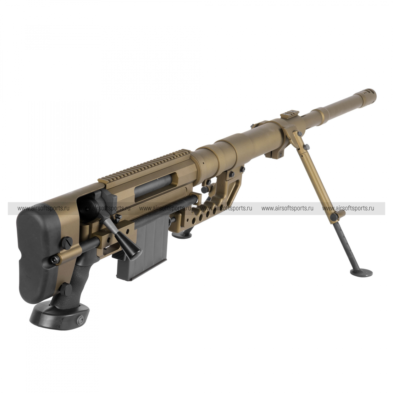 M200 производит впечатление «тяжёлой» снайперской платформы: длинный ствол, массивная ствольная коробка и развитые элементы обвеса формируют мощный, узнаваемый образ. Винтовка оснащена складными сошками, а также крупным скелетным прикладом с выраженными регулировками — всё выглядит строго и функционально. Сверху тянется длинная планка под оптику, подчёркивающая снайперский характер модели. В BR (песочном) цвете — это «полевой» и современно-армейской вариант, с эффектным контрастом отдельных тёмных элементов.