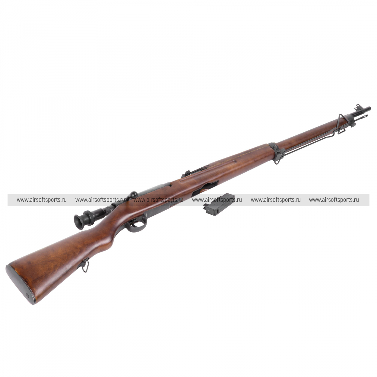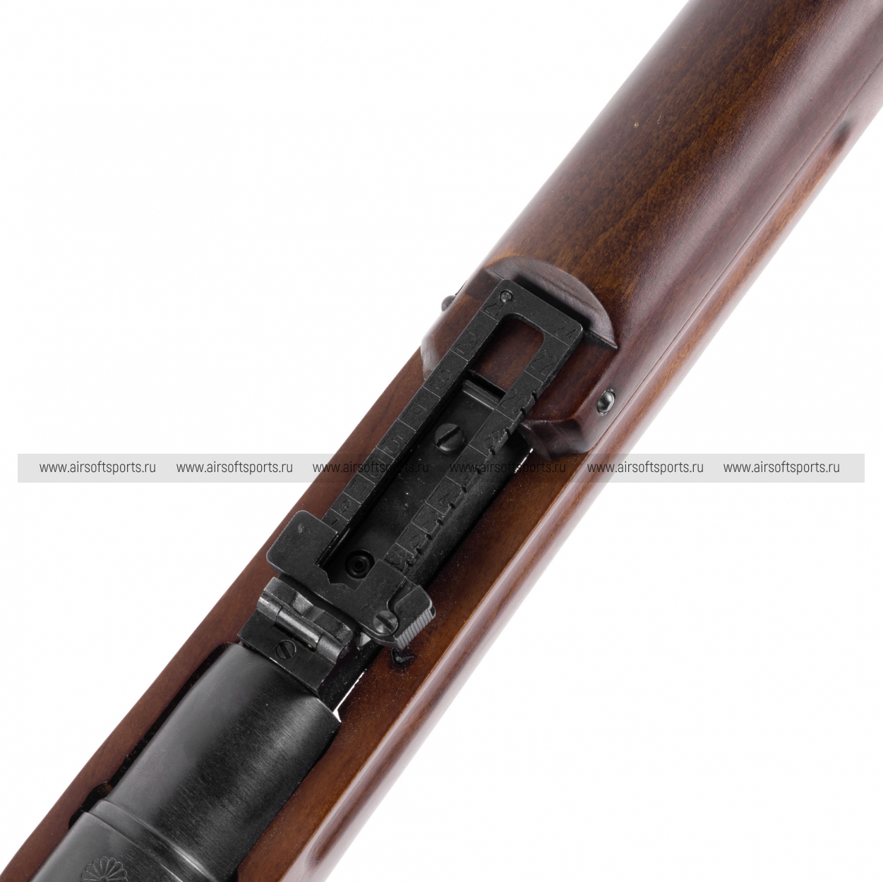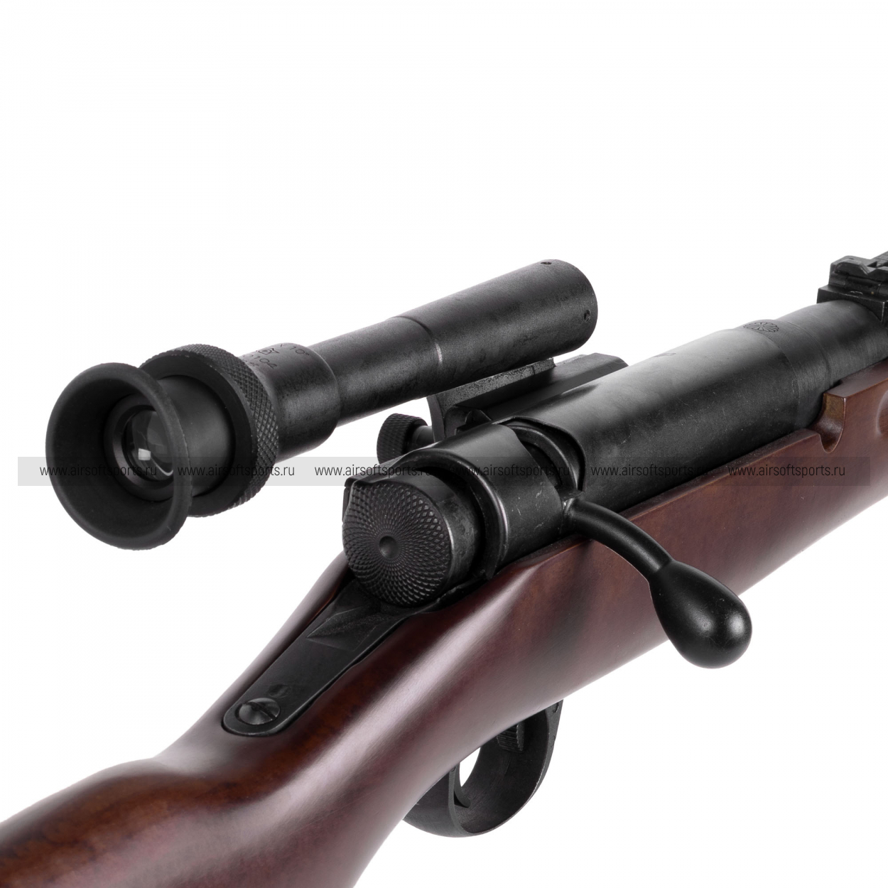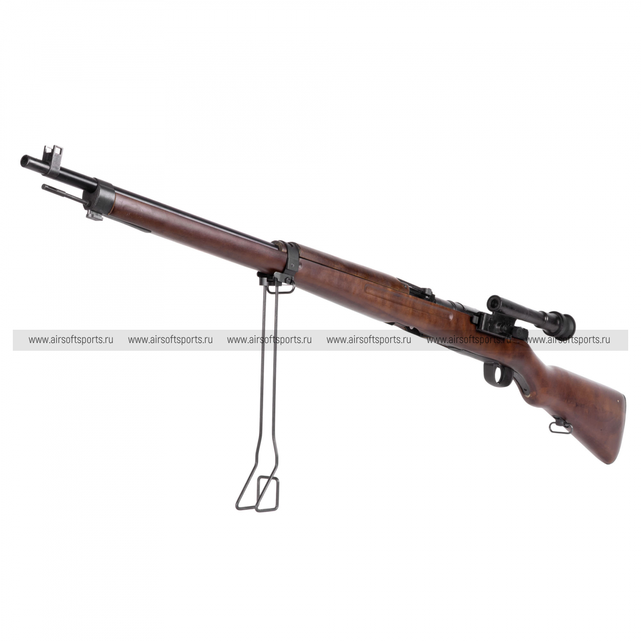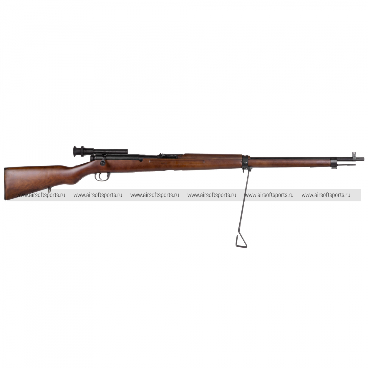 Визуально винтовка выглядит очень аутентично: длинный ствол и вытянутые линии ложа формируют классический «винтовочный» силуэт, а дерево (Real Wood) с тёплым оттенком и заметной текстурой добавляет ощущения настоящего оружия. Слева на ствольной коробке установлен компактный оптический прицел в характерном боковом креплении — ключевая деталь, сразу выдающая снайперскую версию. Дополняет образ складная опора/монопод под передней частью, а тёмные металлические детали и минималистичная фурнитура сохраняют строгий, полевой стиль без лишнего декора.