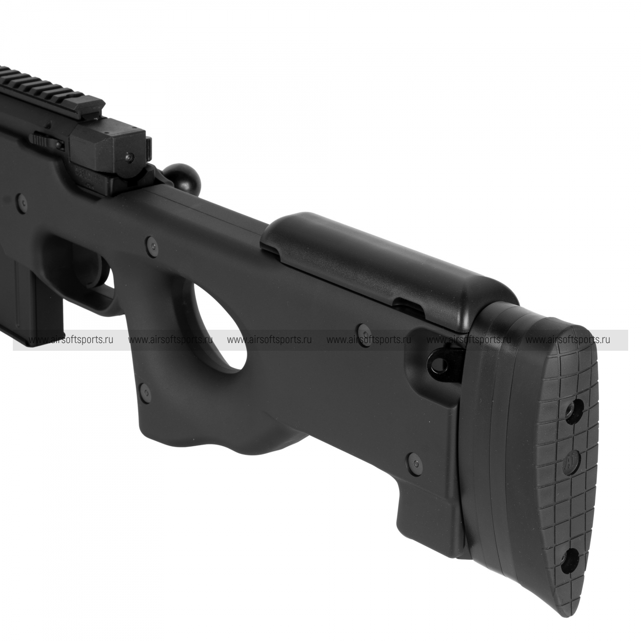 Корпус L96 AWS выполнен из прочного полимерного материала с характерной формой приклада под правшу и развитой пистолетной рукоятью, что делает хват удобным при длительном прицеливании. Металлические элементы включают внешнюю часть ствола, затворную группу и ключевые узлы механизма, создавая ощущение монолитной и надежной конструкции. На верхней части установлен стандартный планочный интерфейс (рельса) для монтажа оптических прицелов, поскольку прицел в комплект, как правило, не входит и подбирается отдельно под задачу стрелка. На цевье предусмотрены пазы для крепления сошек, позволяющие использовать винтовку в классическом снайперском формате «с опоры» для максимальной стабильности. Регулируемый затыльник и форма приклада помогают подогнать удобную посадку под стрелка, за счет чего винтовка комфортно удерживается при стрельбе лежа и с упора.