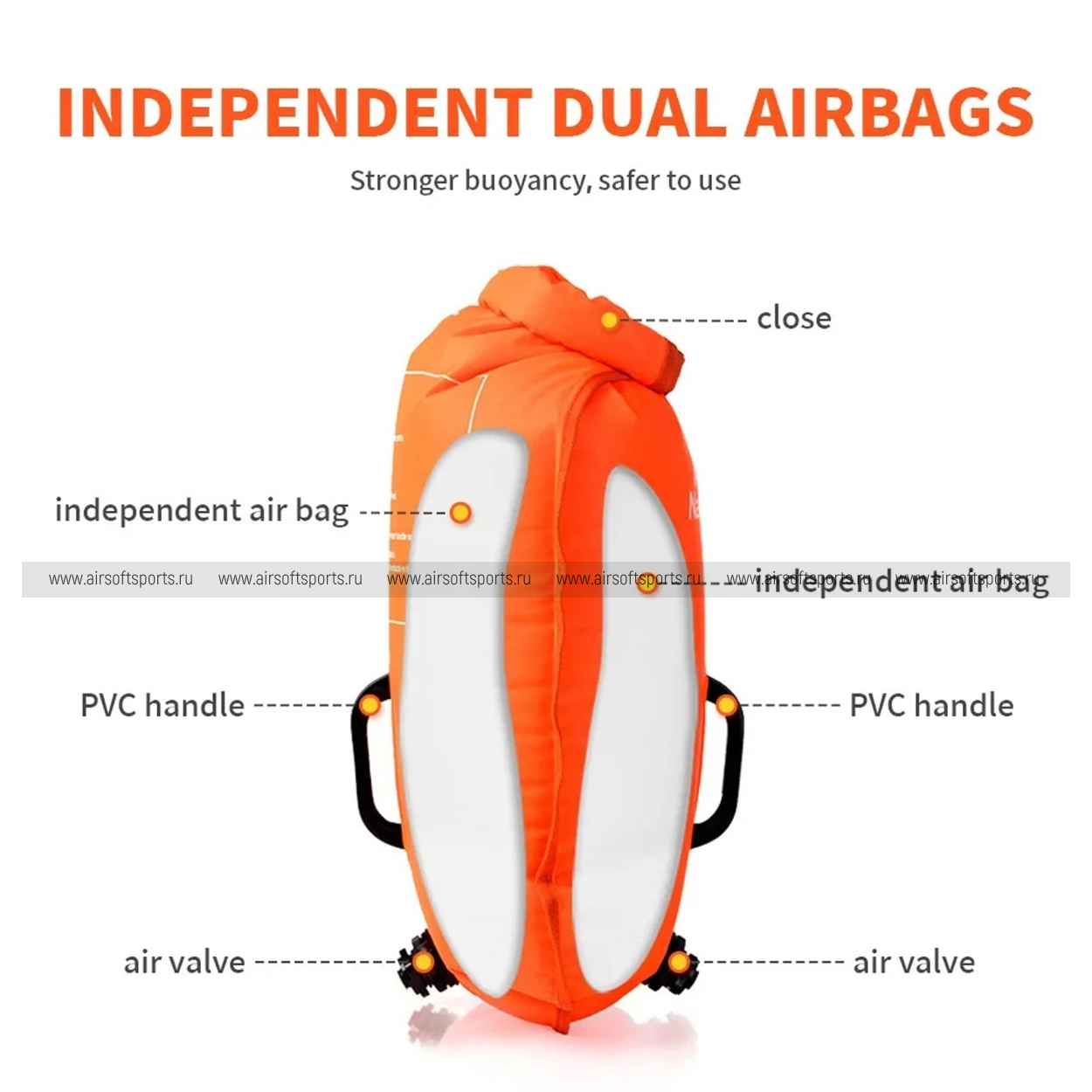 Герметичная конструкция с верхним закрутным клапаном и фастекс-застежкой предотвращает попадание влаги внутрь, а плотный износостойкий материал со сварными швами выдерживает активную эксплуатацию и легко очищается. Встроенный воздушный клапан позволяет быстро надувать сумку после упаковки — так она лучше держится на поверхности воды, становится заметнее и обеспечивает дополнительную амортизацию для вещей. Внутренний объем удобно подстраивается под нагрузку: сумка подходит для одежды, полотенца, легкой обуви, перекуса и аксессуаров; при необходимости может служить импровизированной подушкой или валиком для отдыха на берегу.