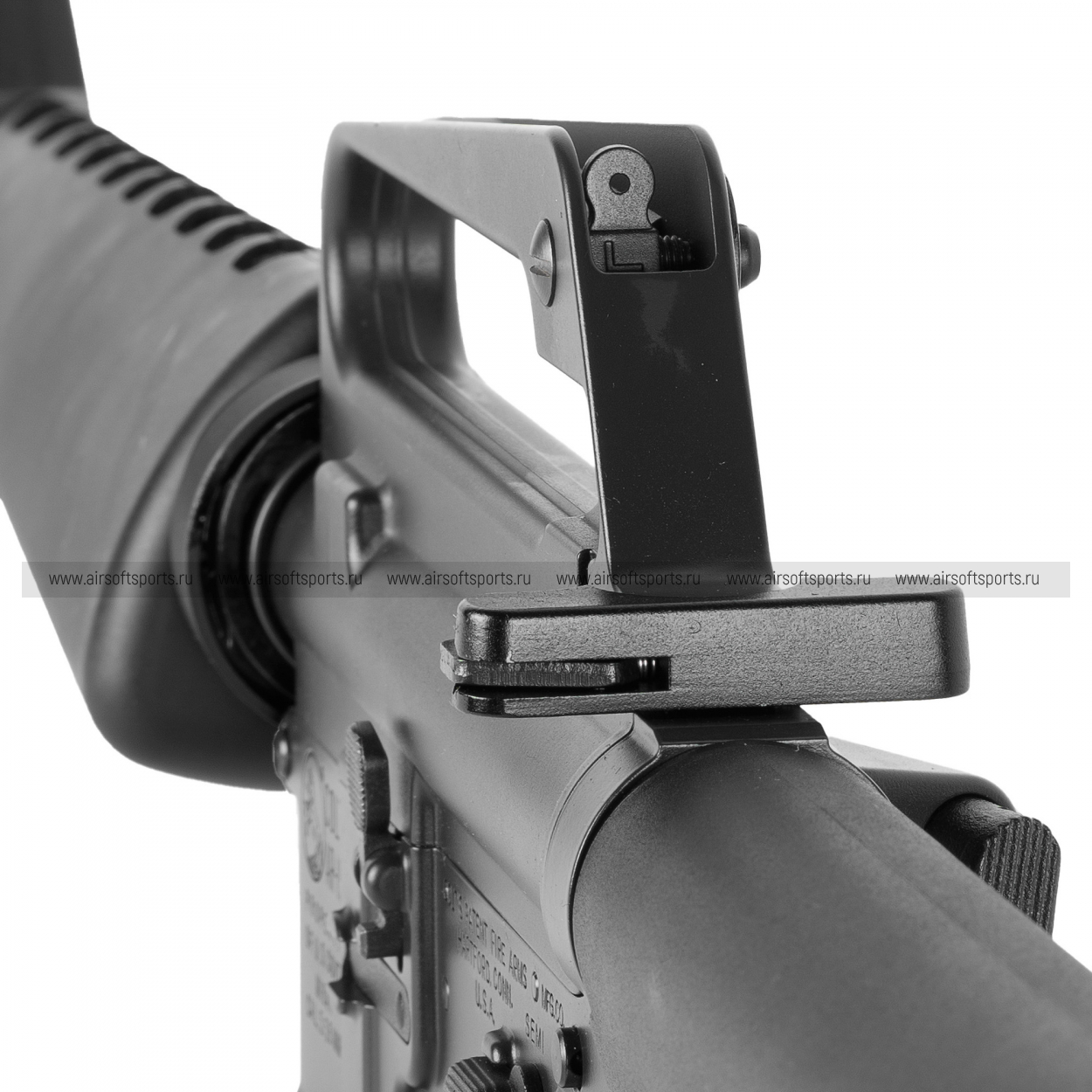 Мушка выполнена в виде треугольной стойки, а диоптрический целик расположен на верхней части корпуса, что соответствует оригинальной конструкции. Ручка для переноски интегрирована в верхнюю часть ресивера и также служит базой для установки прицельных приспособлений.